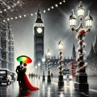 In a rainy street, a couple shares a passionate kiss under a bright red umbrella. The woman's sparkling dress and heels contrast with the moody backdrop of city lights and shadows.