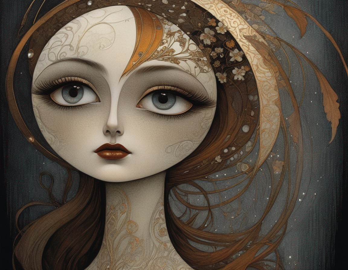 An intricate portrait of a fair-skinned, ethereal woman with wavy hair, adorned with a delicate golden headdress and subtle floral motifs.