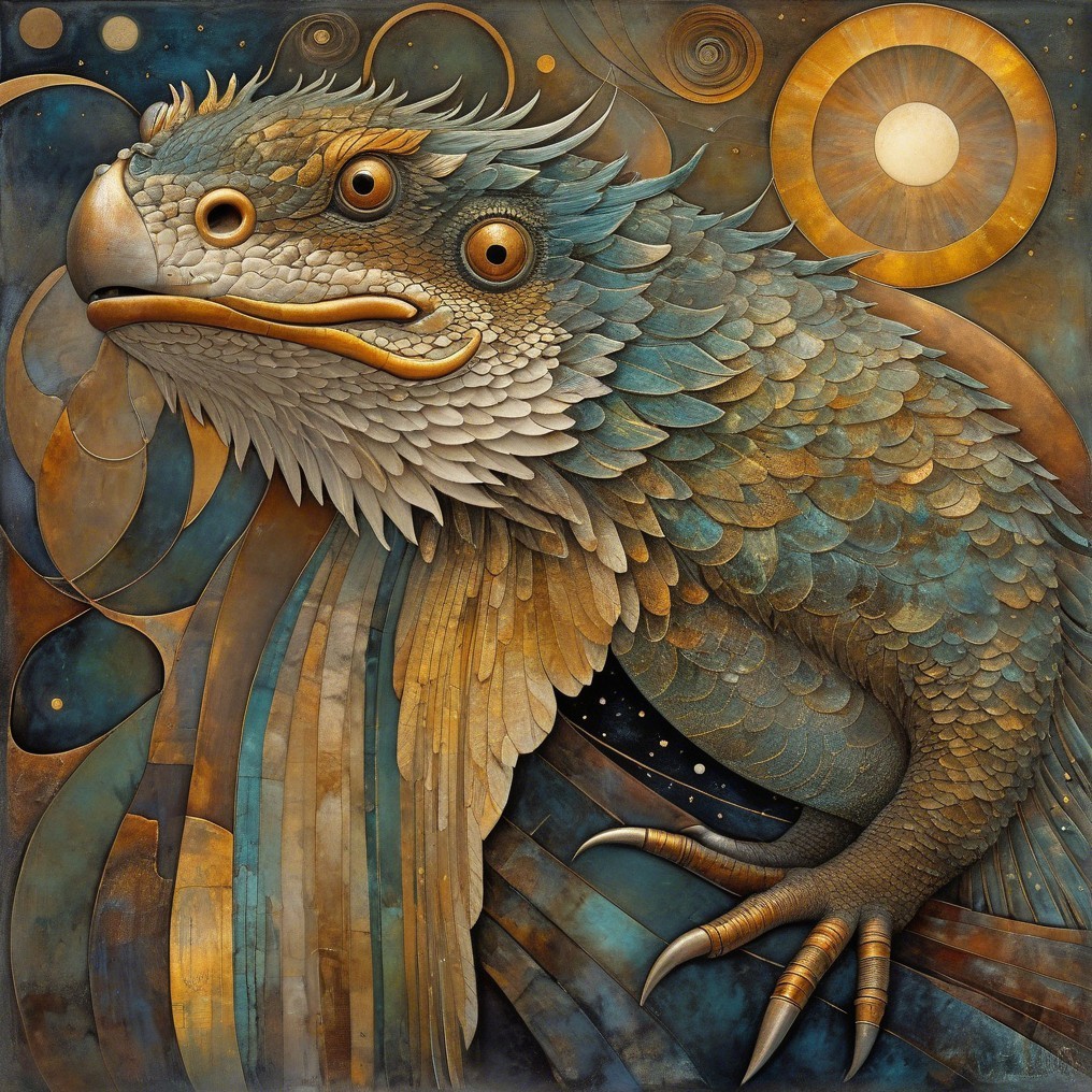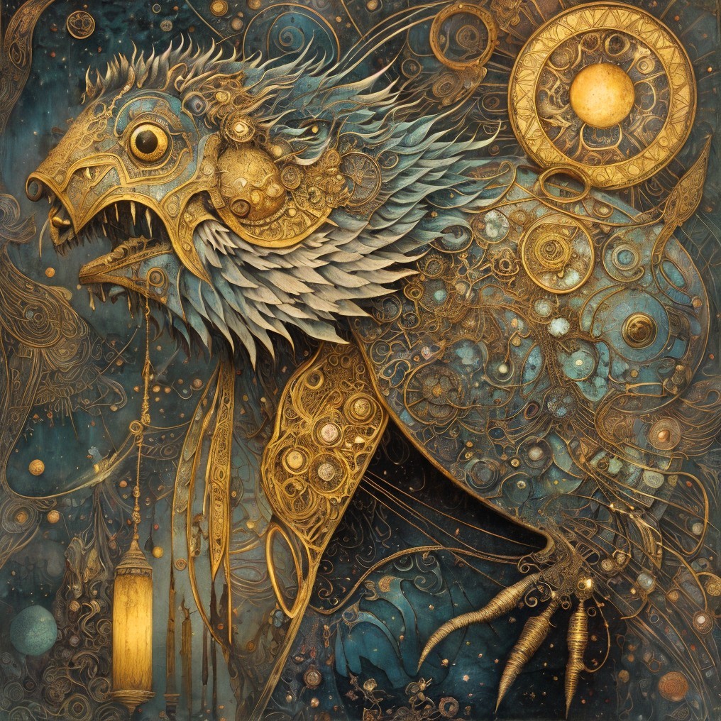 + Prompt:Surreal creature of night, of history and death and of light” in the style of Alexander Jansson and Watanabe Shōtei, nostalgia, glory, Mercury Glass patina, light and gossamer haze, topographic lines, Art Brut, moody, somber, desaturated colors. In the style of John Rogers cox . This artwork amalgamates the artistic styles of Michael Parkes,