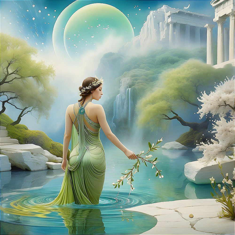 A serene figure in a flowing green gown stands in tranquil water, holding a branch. Surrounded by ethereal landscapes, ancient ruins, and a glowing celestial backdrop, it evokes a sense of peace and beauty.