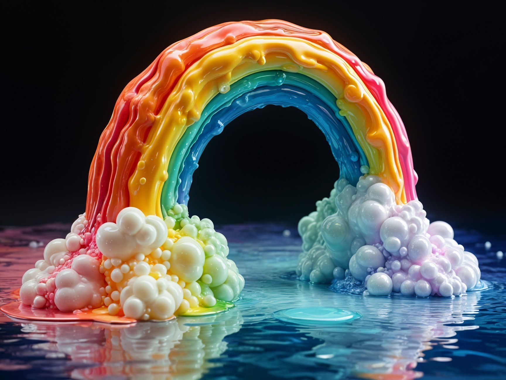 Prompt: "Create a vibrant and captivating image of a rainbow, intricately styled to resemble a fluid, melting form. The rainbow should consist of seven distinct, arched bands, each representing the colors red, orange, yellow, green, blue, indigo, and violet, with a glossy texture that suggests the colors are made of paint or liquid. Beneath the rainbow, include a swirling mass of soft, billowing clouds in shades of white and light gray, resembling vapor or mist.