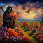 A skeletal figure in dark robes rides a bicycle through a vibrant landscape, with lush flowers and waterfalls, under a colorful sunset. Birds soar above, adding to the surreal atmosphere.