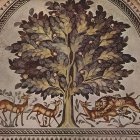Mosaic panel of Good and Evil - an apple tree with two deer on its right and a lion preying on a deer on its left --- Jericho, Palestine 735_ Hisham's Palace is located in Palestine, 5 kilometers north of the city of Jericho, and is considered one of the most important tourist landmarks in Palestine. The palace was built by the Umayyad Caliph Hisham ibn Abd al-Malik between 724–743 AD.