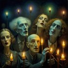 A haunting group portrait featuring eerie, pale figures with exaggerated features and unsettling expressions, illuminated by flickering candlelight. The atmosphere is dark and mysterious.