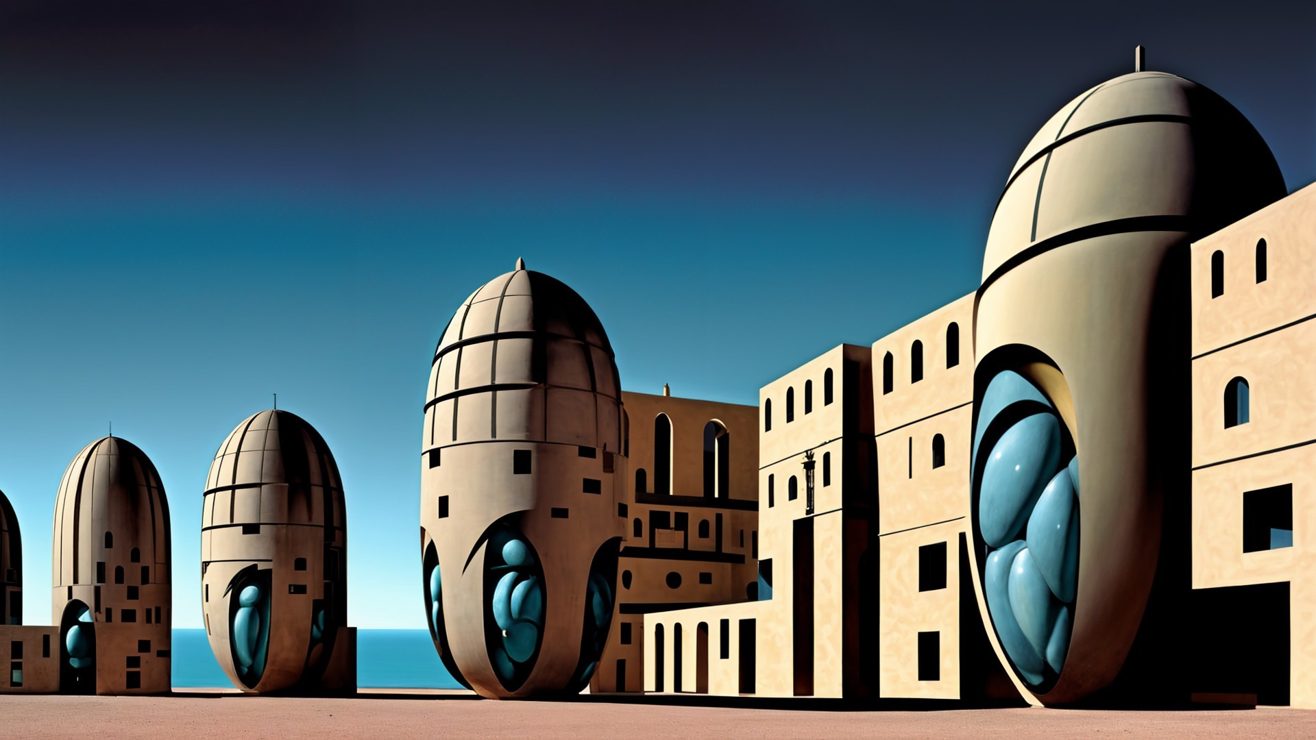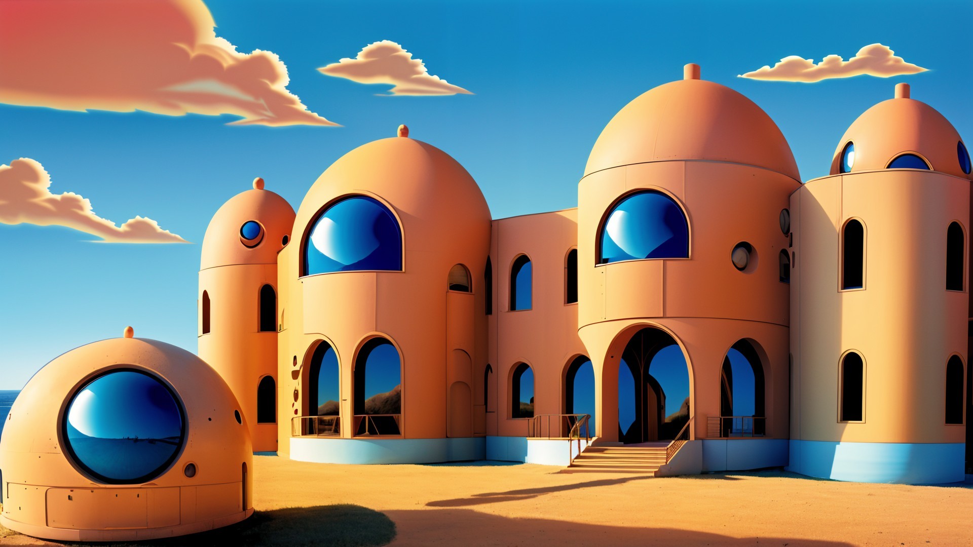 A dreamy landscape features grand, curved structures with domes and arches, set against pastel skies filled with fluffy clouds. The scene radiates serenity and imaginative elegance.