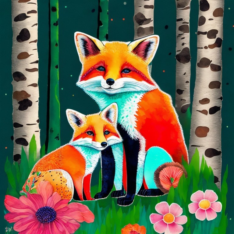 Prompt: "Adorable red fox cub with his mom on the background of turquoise green birch groove with forest anemones: illustration style Hugo Pratt, Pop Art, spatter paint, spots of colour"
