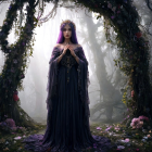 A mystical scene featuring a woman in a flowing dark gown, standing in an enchanted forest surrounded by lush greenery and colorful flowers, exuding a sense of ethereal beauty and tranquility.