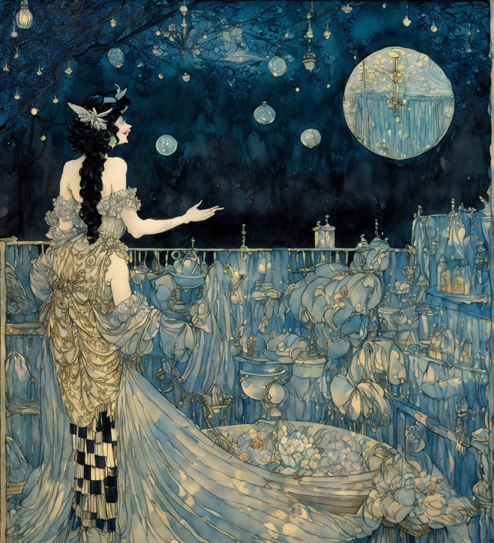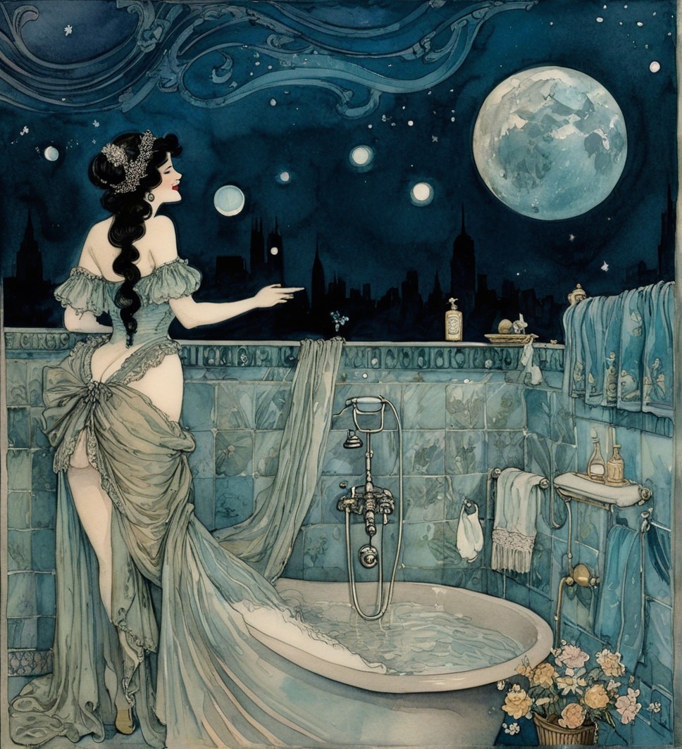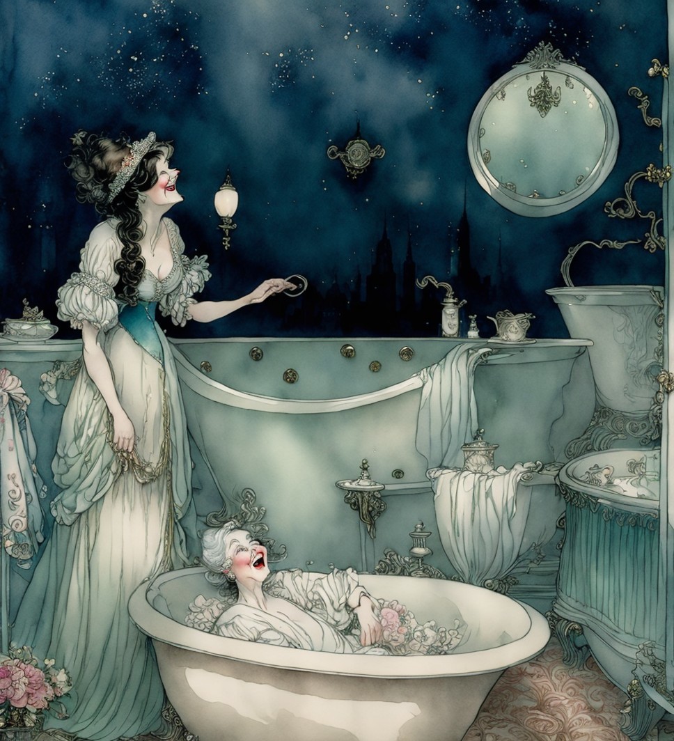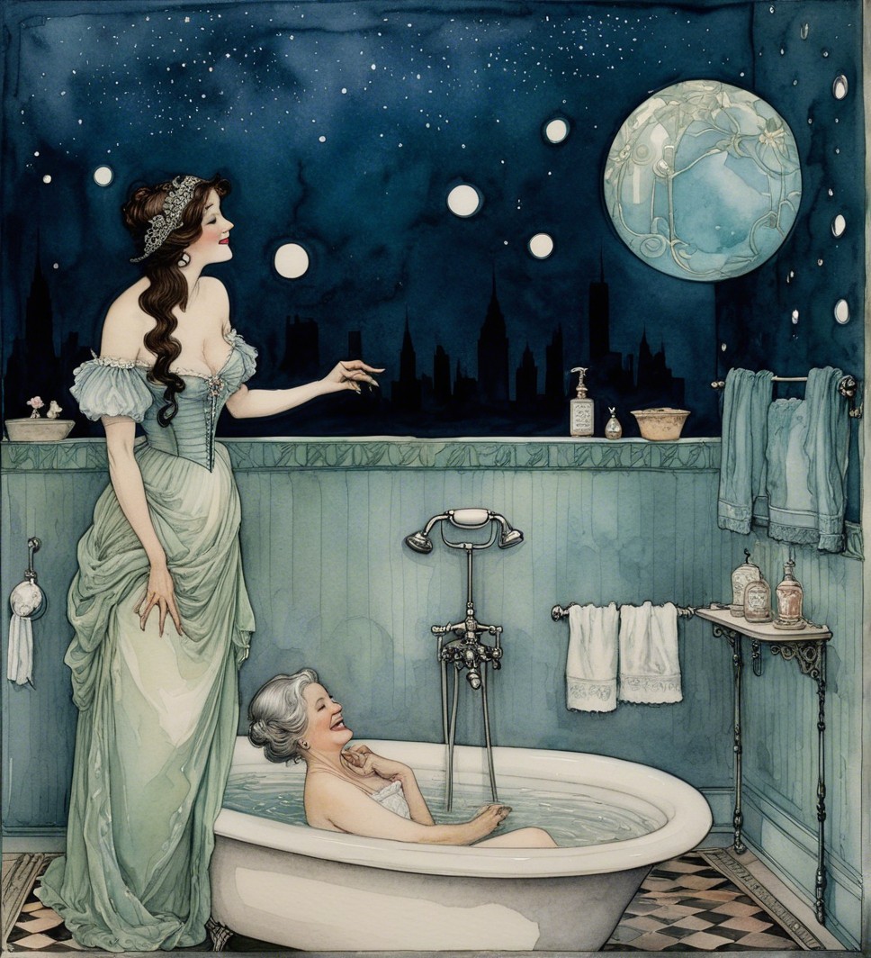 Two elegantly dressed women share a moment in a vintage bathroom. One stands near a large bathtub, pointing joyfully, while the other relaxes in the tub, holding a glass amidst a serene, starry backdrop.