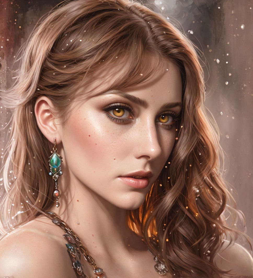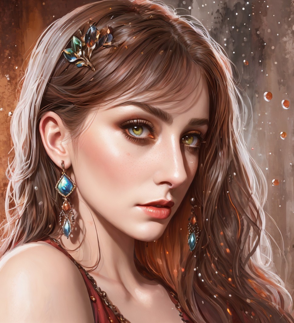 Prompt: "Expressionist portraiture, beautiful female enchantress in front of brown stonewall, edwardian, detailed nose, realistic devilish eyes, dynamic lighting 1.9, gouache paint, grunge, high contrast, High coloring, detailed close-up portrait, stylized face, watery alcoholic painture and ink, dots and flares and splashes, soft edges, back-lit, triadic color scheme orange beige red, orange lighting, brushed paint, style of paint dripping technique, wet on wet painting, hues, radiance, plasticity 1.6, streamline futurism, chiaroscuro lighting, ambient occlusion 1.5, shadow mapping 1.8, 3d effects 1.8, stylized hairstyle, brightness 1.7, stylized chipped background, fine lines, abstract, coherent, hues, eerie, occult, retropunk, creamy, sweaty, tribal, occult, Anglocore 1.9, auracore, high coloring 1.9, mosscore 1.7, cottagegore 1.9, atompunk, brightness 1.4, silver particles, dreamy glow, tints of abstract art nouveau illustration, Kinky Pop Surrealism, illustration on old paper, tints of timlin, 3d effects 1.8, shadow mapping 1.3, dynamic lighting 1.7, ambient occlusion 1.5, anisotropic filtering 1.9, raytraced shadows, ethereal, otherworldly, abstract style 1.7, hues, grain, blurry aura, fantasy movie still, synthetic essence, raytraced shadows, dark fantasy art, highly chipped background, embossed flares, bright streaks, bioluminescent details 1.9, octane render illustration, tints of 1970s advertising art, intricate ornamental details 1.9 , octane render"