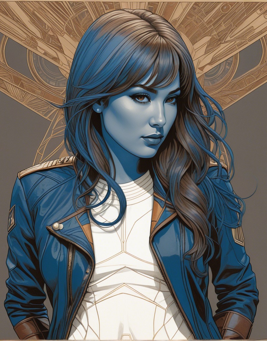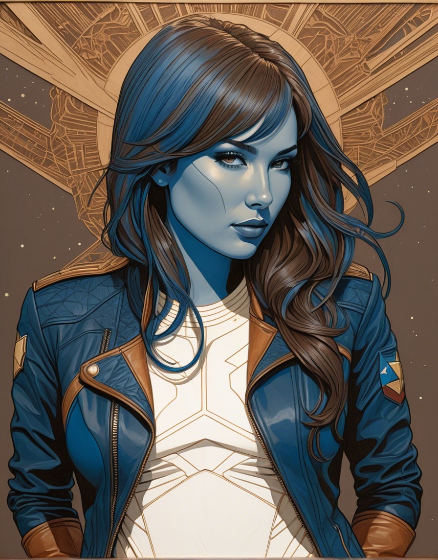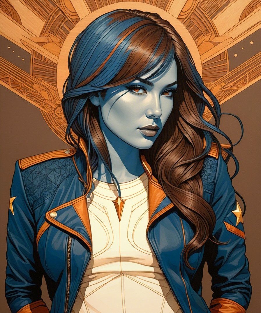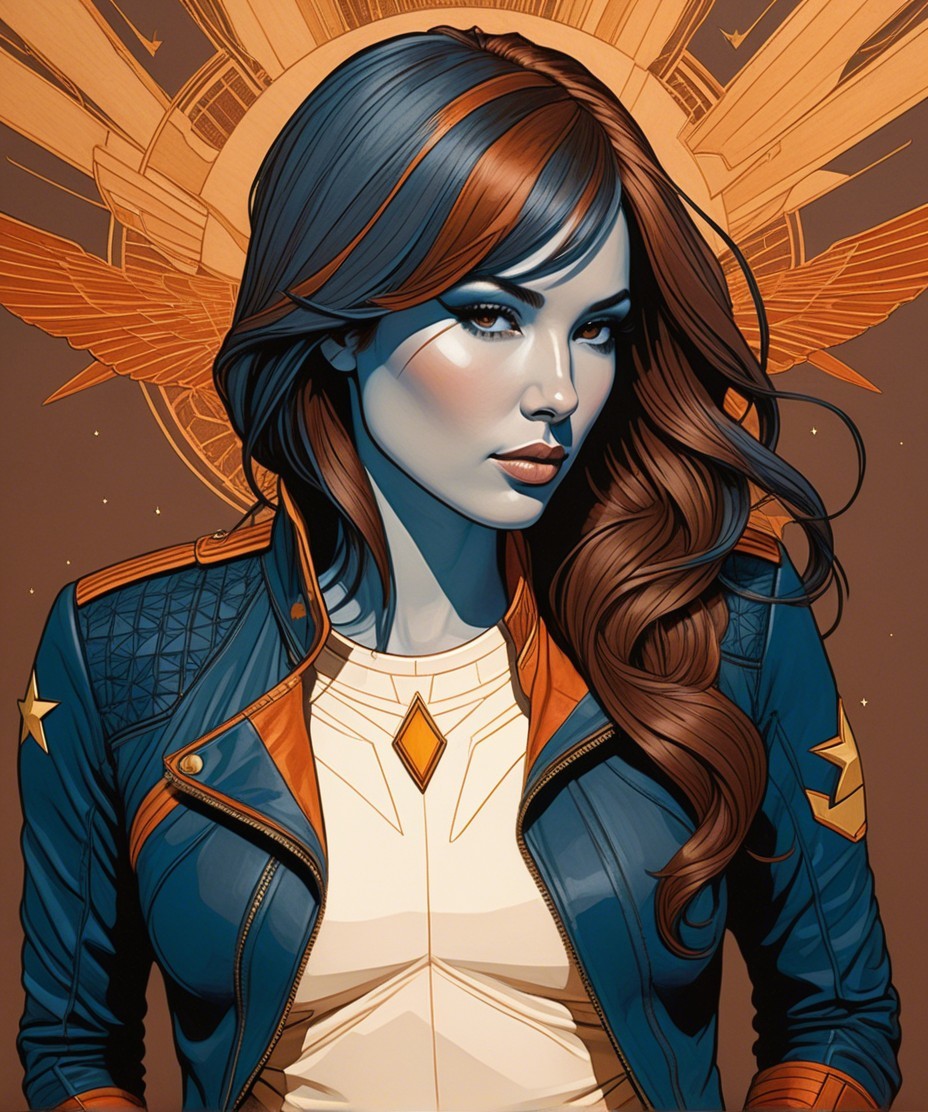 Prompt: Fiery female upper body portrait, comic book-inspired art, reminiscent of Frank Miller and Freda People's styles, fusion of pyrography and delicate linework. Detailed contouring with fine lines, curved cuts technique, copacetic, funky, sloppy asymmetrical geometric pulp art, vibrant patterns, intricate woodcarving elements, and orphism influences. Warm earthy tones like brown, starfleet-blue, ochre, and beige, carved wood aesthetic, mystical ambiance, serene vibes, bold linework, dyed textures in geometrical background, visible textures, enlightened depth, square aspect ratio of 1:1 with a high quality of 750 pixels, coloring with brightened hues, gradient inking colors, 3 point lighting, heroic, revealing, disclosure, balanced, abstract post-avantgarde, dreamy exaggerated features, sculpted, flowing hair illusion, ethereal atmosphere, fabric, luminism, plasticity 1.6, dynamic lighting effects, ambient occlusion, hues by Brad Kunkle,, tactile feel, detailed vivid coloring and stacked lines, industrial design, sgrafitto reminiscence, parallax occlusion.128K UHD for crisp quality. Integrate light reflections to add depth for realism and atmospheric feel. Utilize 3D textures and raytraced shadows 1.3 for a drifting, 3-dimensional effect by volumetric lighting for a captivating ambiance. Emphasize vibrant pencil sharp edges, stylized textures, and a wide array of colors for a dethereal appearance. Infuse the scene with a soft glow, creating a psychedelic and mesmerizing visual diffuse lighting, ambient occlusion enhancing the overall effect.