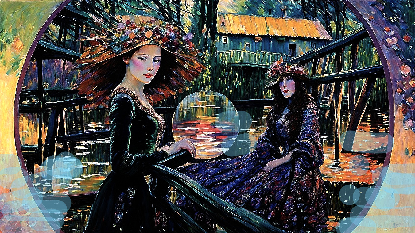 Two women in elegant, dark attire sit by a tranquil waterway, surrounded by lush trees. One wears a large, decorated hat, while the other dons a pointed witch's hat, creating an enchanting atmosphere.