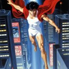 A detailed, full-body portrait of a young, athletic male superhero flying gracefully with a red cape against a dramatic night cityscape, his white tank top and shorts contrasting with the dark background. He is depicted in mid-flight, descending from the top center towards the viewer, with his left arm slightly