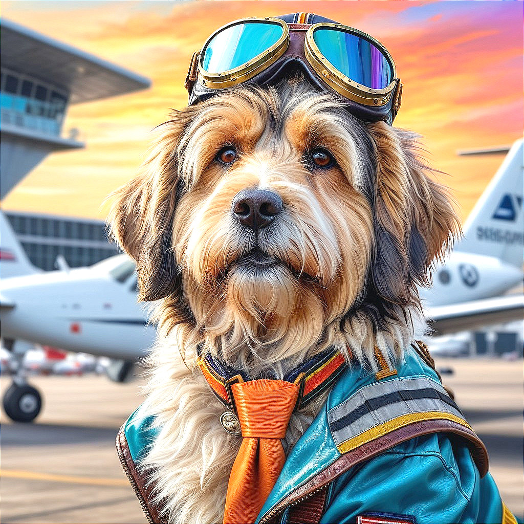 A dog with goggles and a pilot jacket is in front of airplanes during sunrise/sunset.
