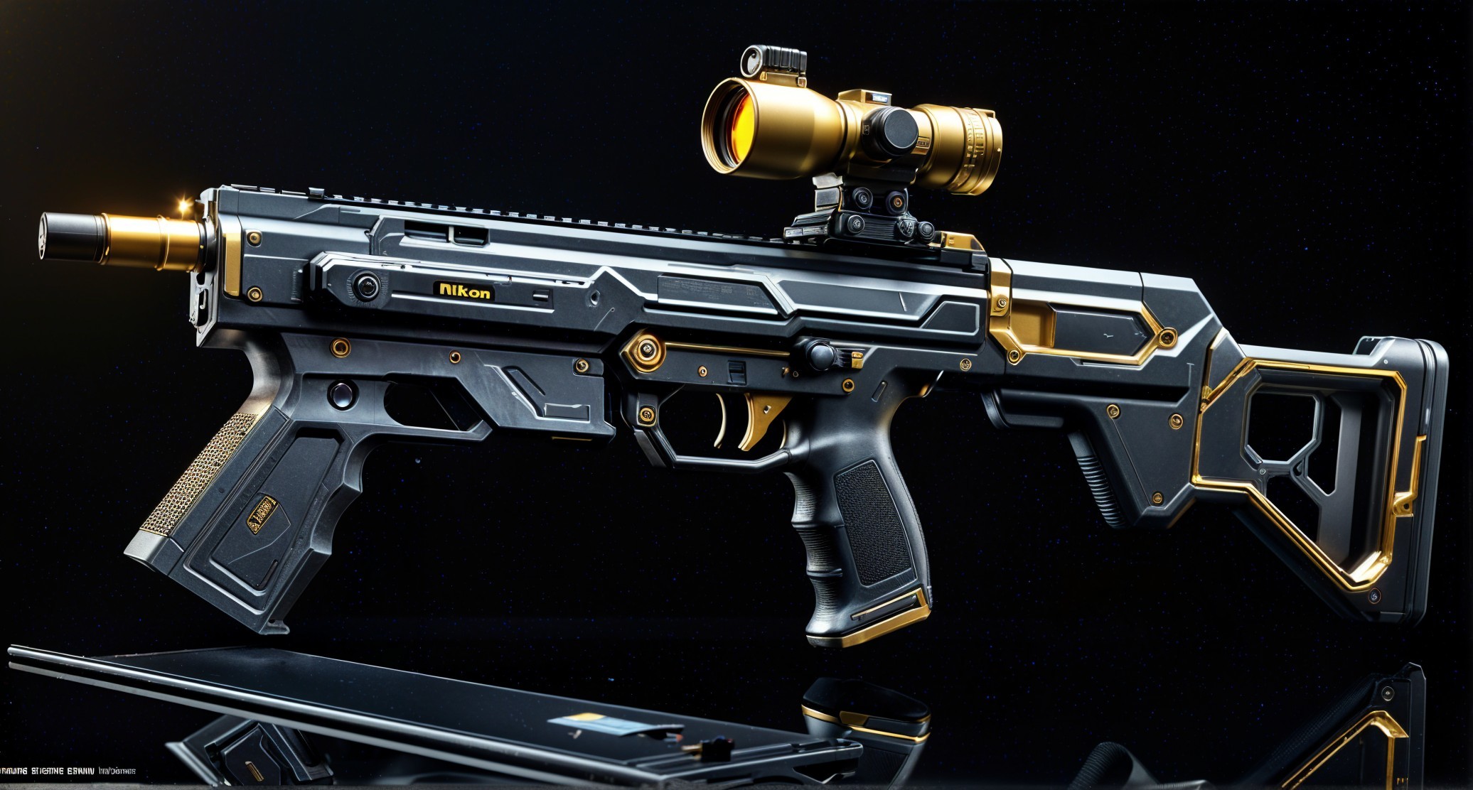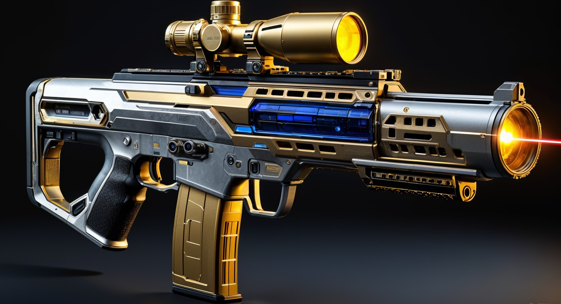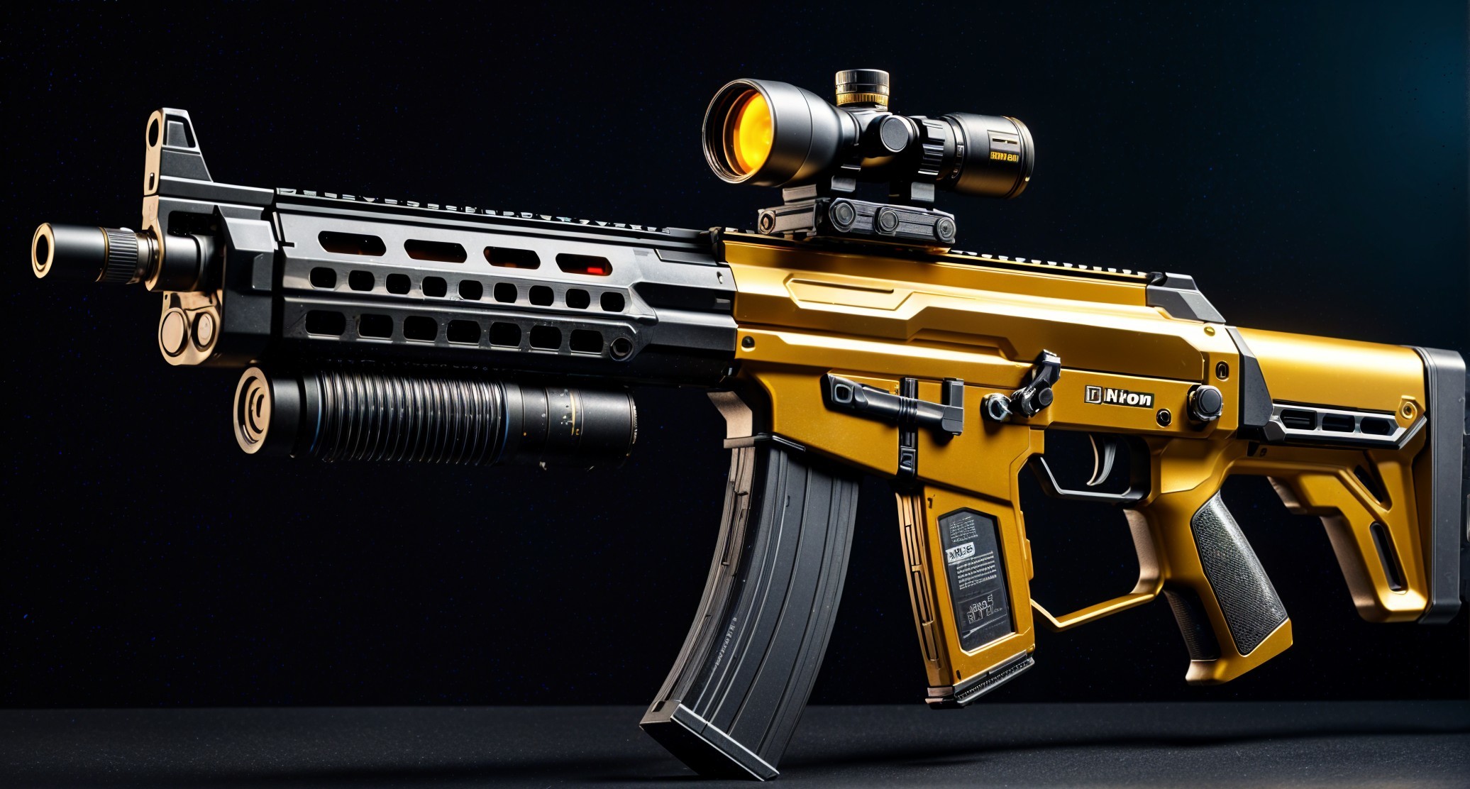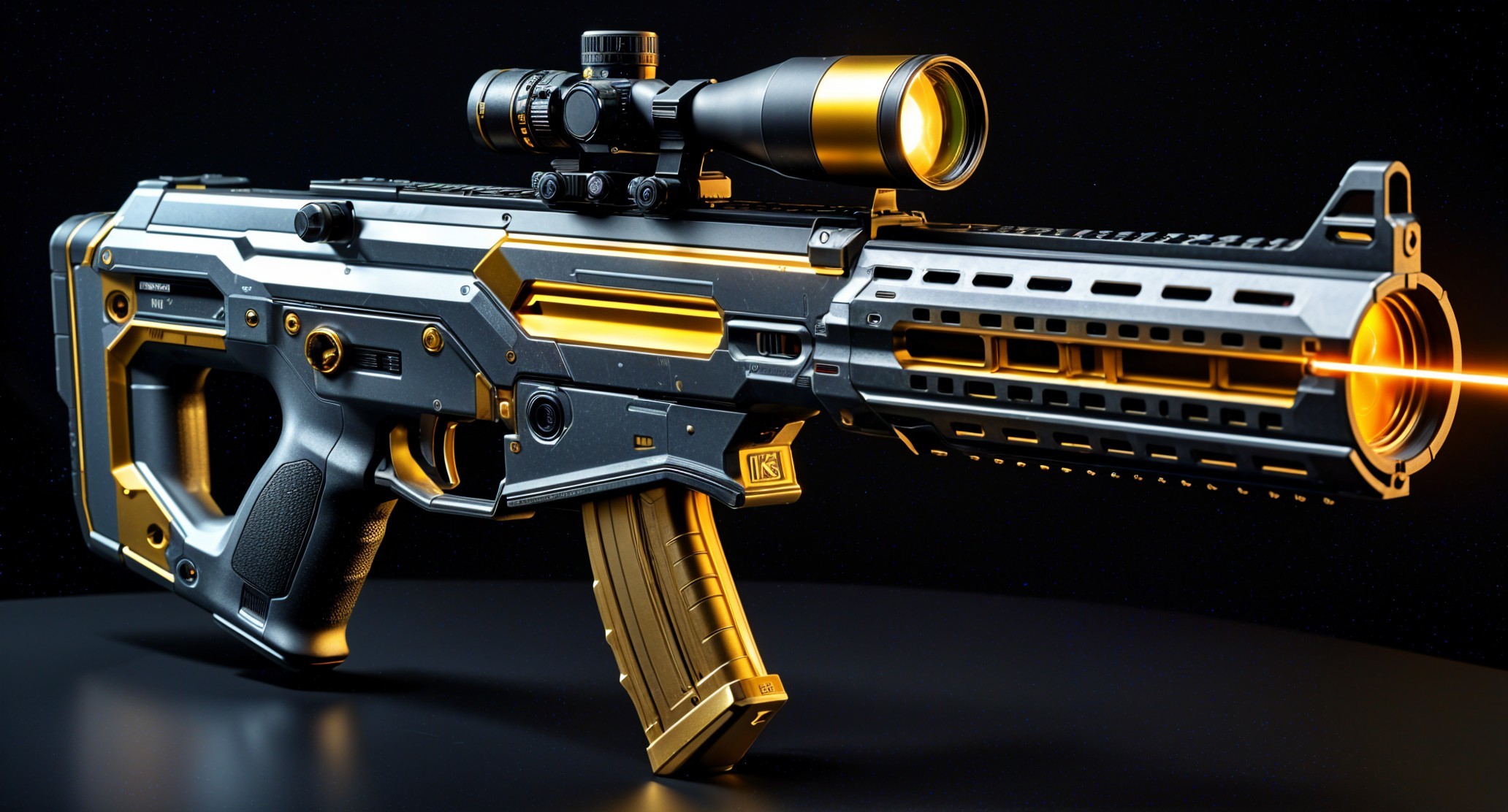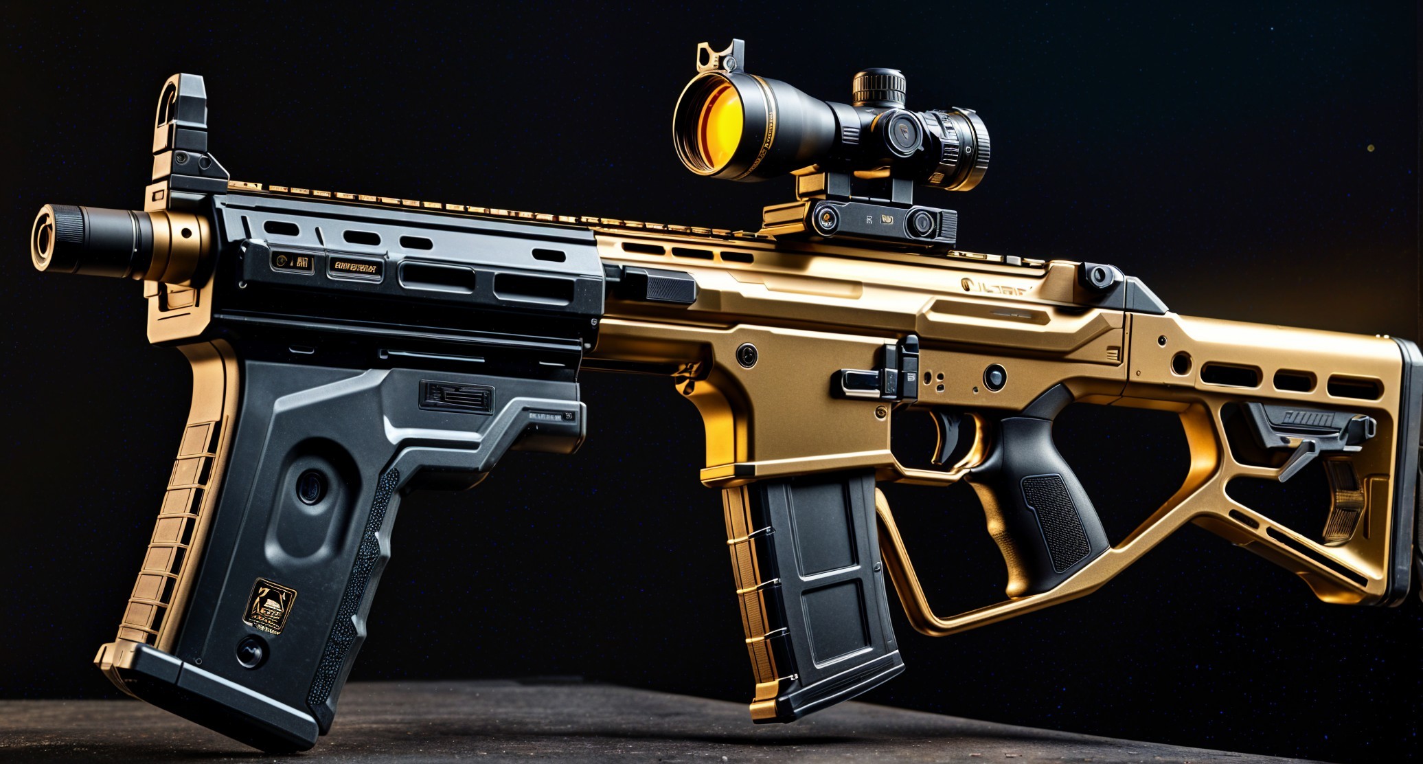 The image showcases a sleek, futuristic semi-automatic rifle with a glossy gold finish. It features an advanced optics sight, a textured grip, and a prominent magazine, set against a dark background.