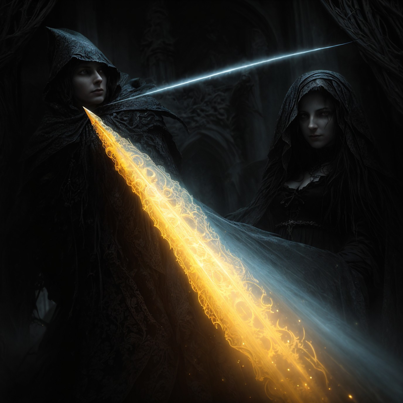 Prompt: seek, and ye shall find; knock, and my blade will be opened into you - optical illusions finely misted webs cut light dark, deep shallow - imprint genetic fingerprint