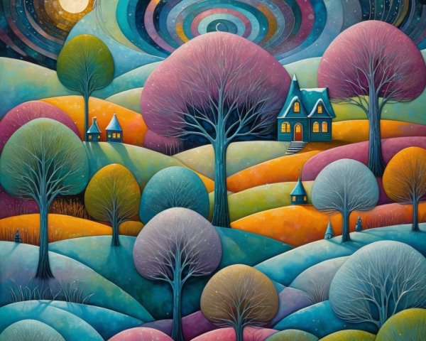 A colorful landscape features rolling hills, vibrant orange trees, and a golden sunset. A figure sits along a winding path near a quaint house, evoking a serene autumn scene.