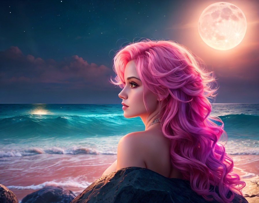 A beautiful woman under the full moon standing on a rock in the sea. She has beautiful pink hair with shells in it.
