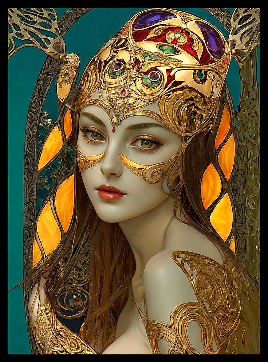 An illustration of a woman with elaborate gold headgear and makeup, set against a teal background with ornate details.
