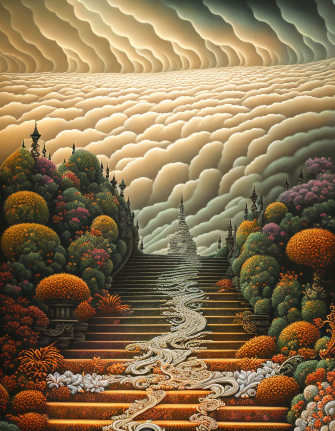 Prompt: Black and White stairway to the underworld, fantastical surrealist otherworldly, vivid colours, ornate, intricate, elegant, surreal, stormy clouds, beautiful high definition acrylic art intricate details, Artist Jacek Yerka, Richard Dennis, ''Beautiful clouds!!!''