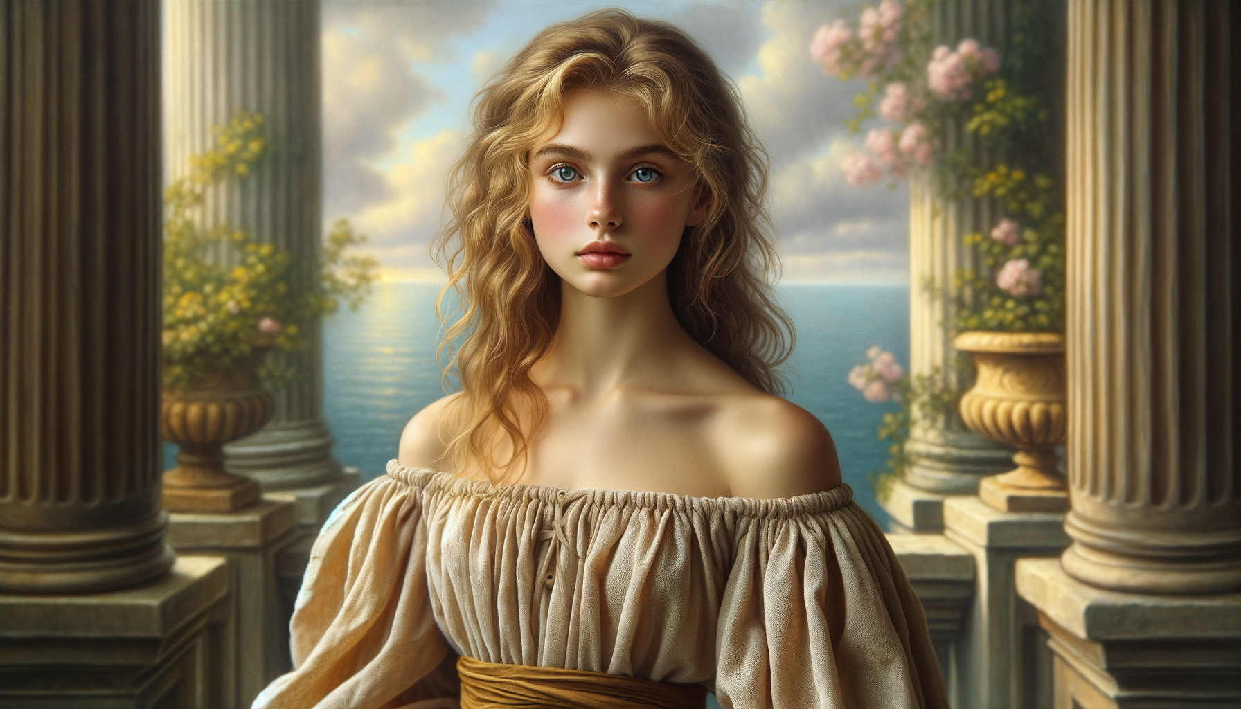 Prompt: in an idyllic Mediterranean scene, a serenely ebullient; buxom girl with red hair and golden highlights, and soft rounded facial features; influenced by Sandro Botticelli; Da Vinci style