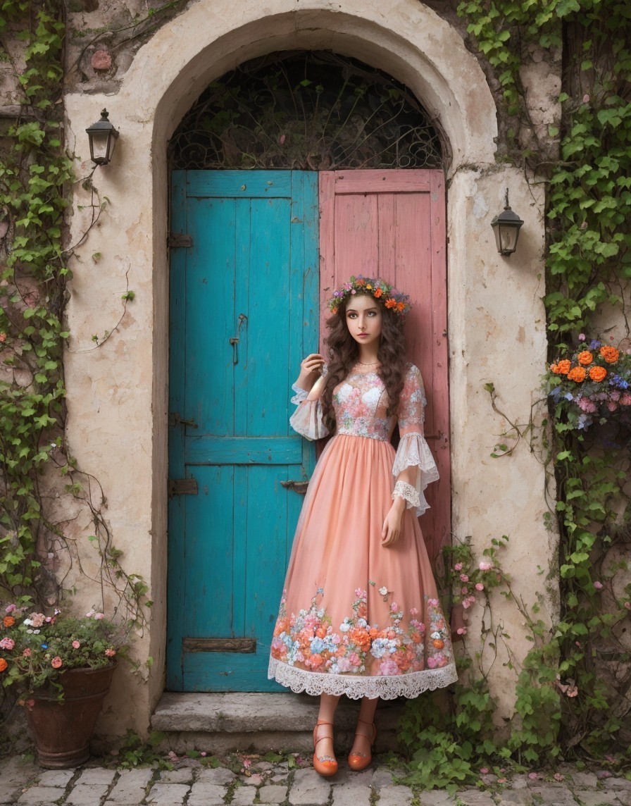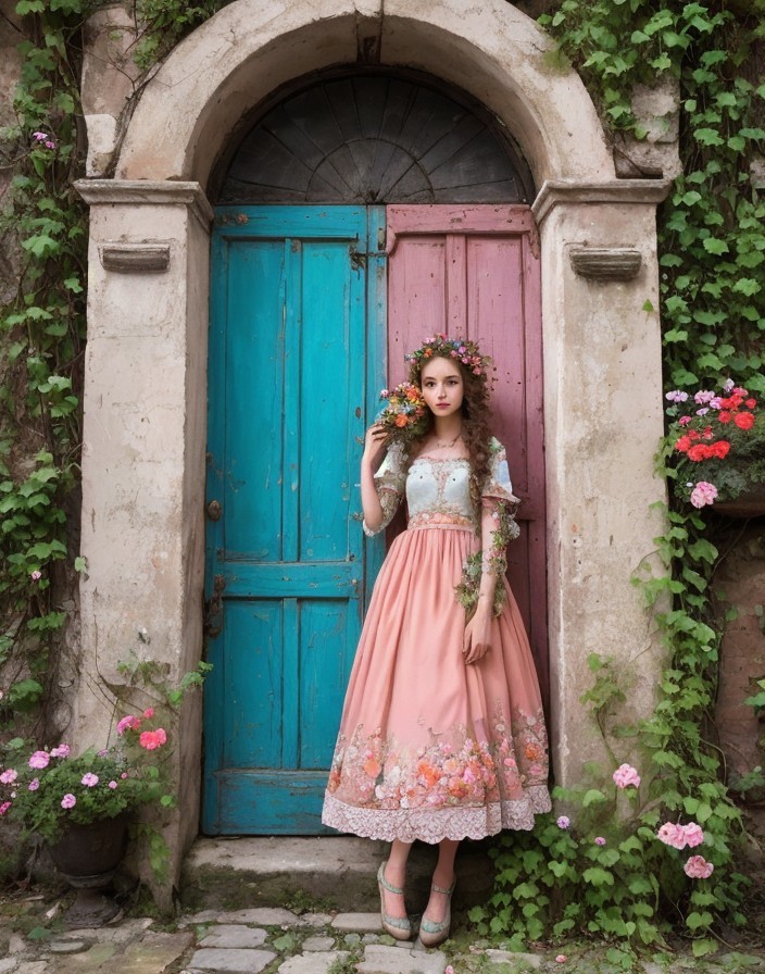Prompt: "Capturing the Beautiful Decay of an Old-Fashioned Door with Vibrant Flowering Vines. Beautiful Mediterranean. Highly detailed, award winning masterpiece"