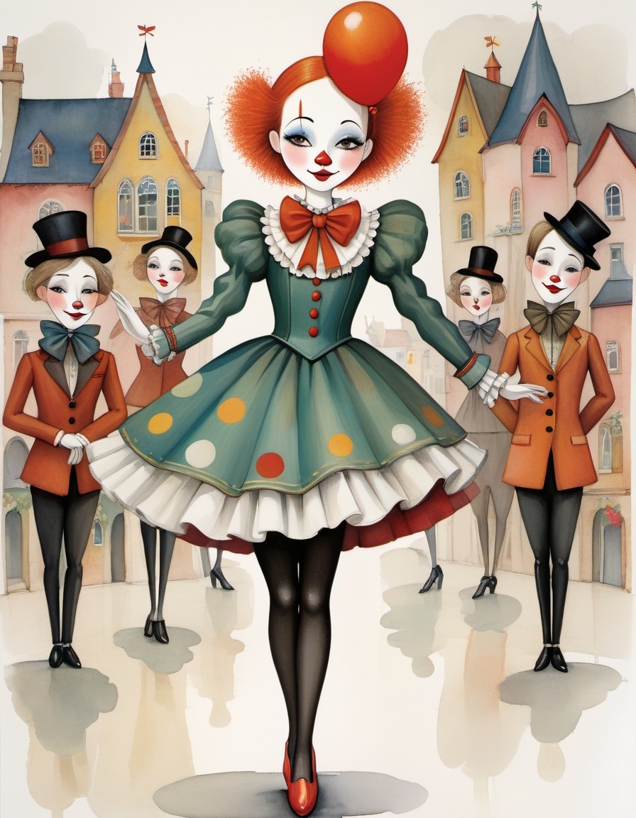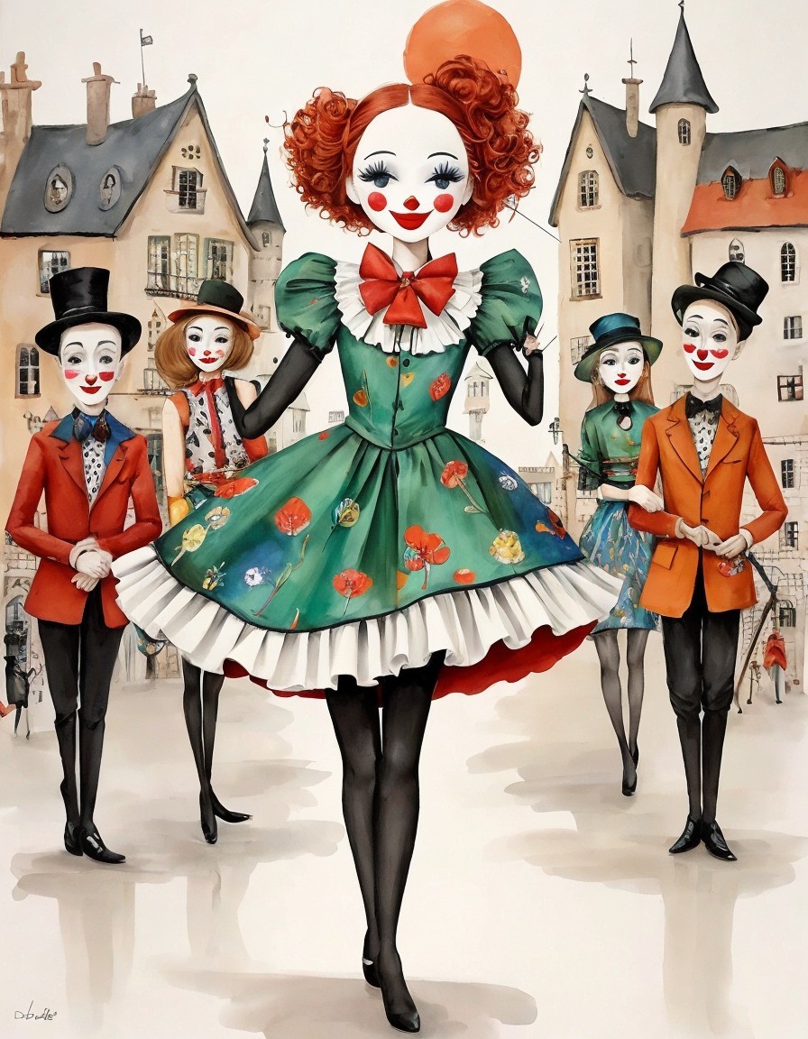 Colorful artwork of stylized figures in vibrant costumes with an imposing character in the center against a backdrop of whimsical buildings.