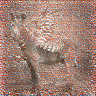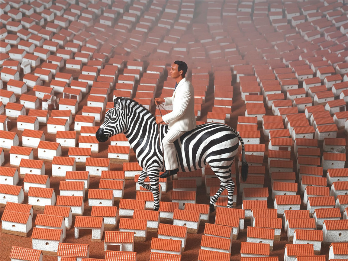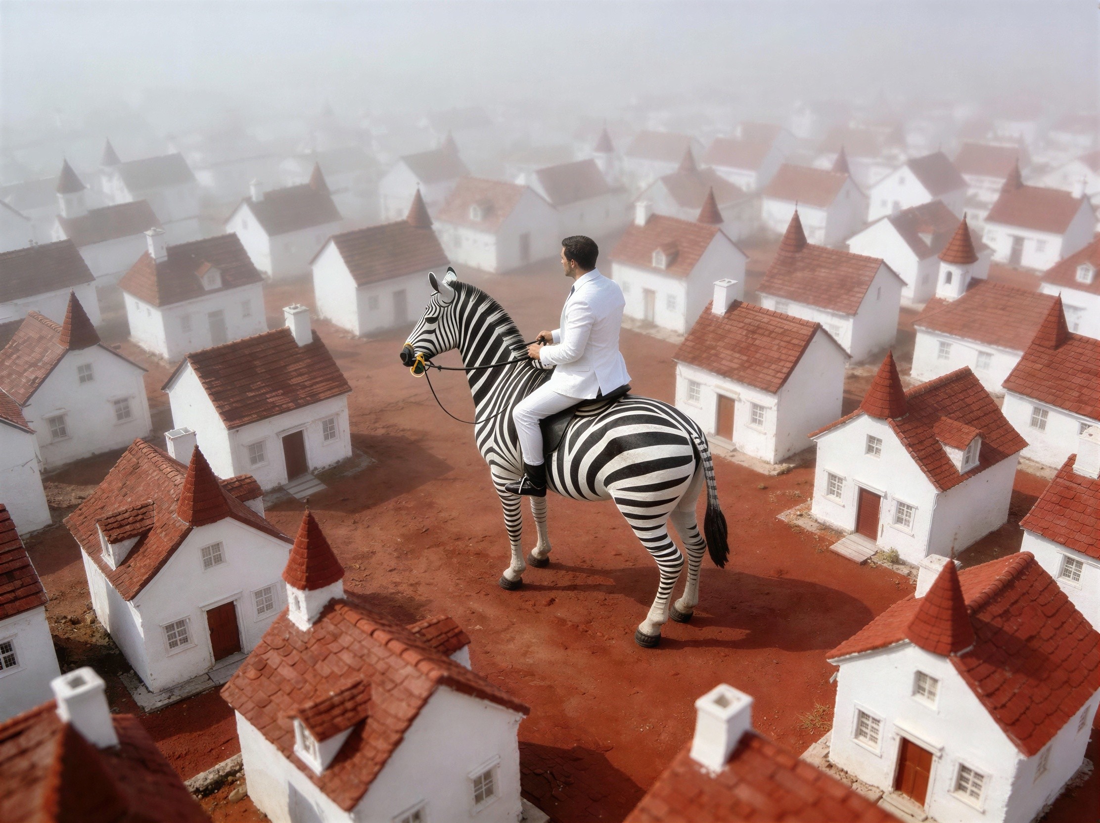 High-angle shot of a man in a white suit riding a zebra in a surreal, misty village of miniature white houses with red roofs and orange dirt ground, a vibrant surreal landscape.