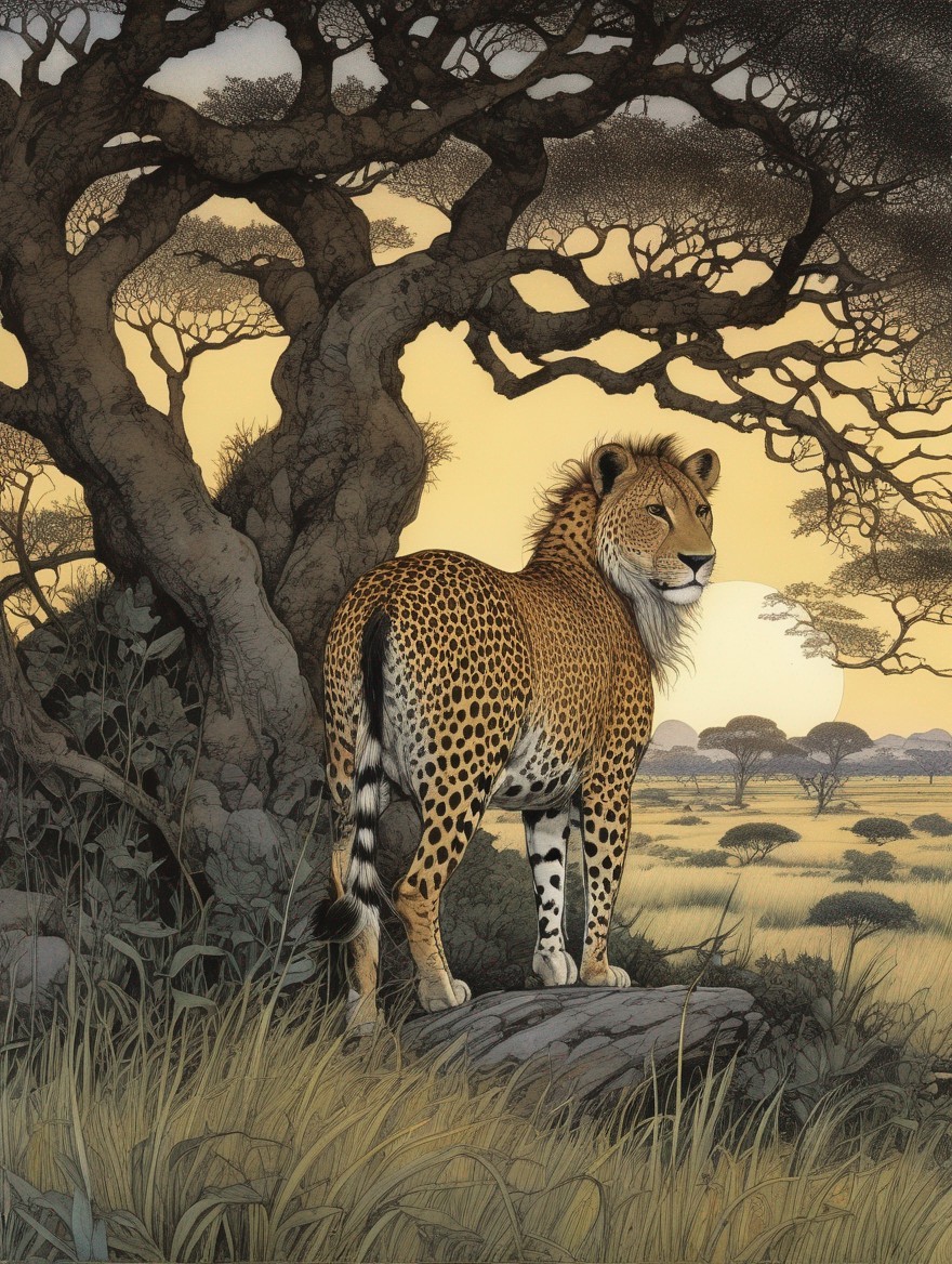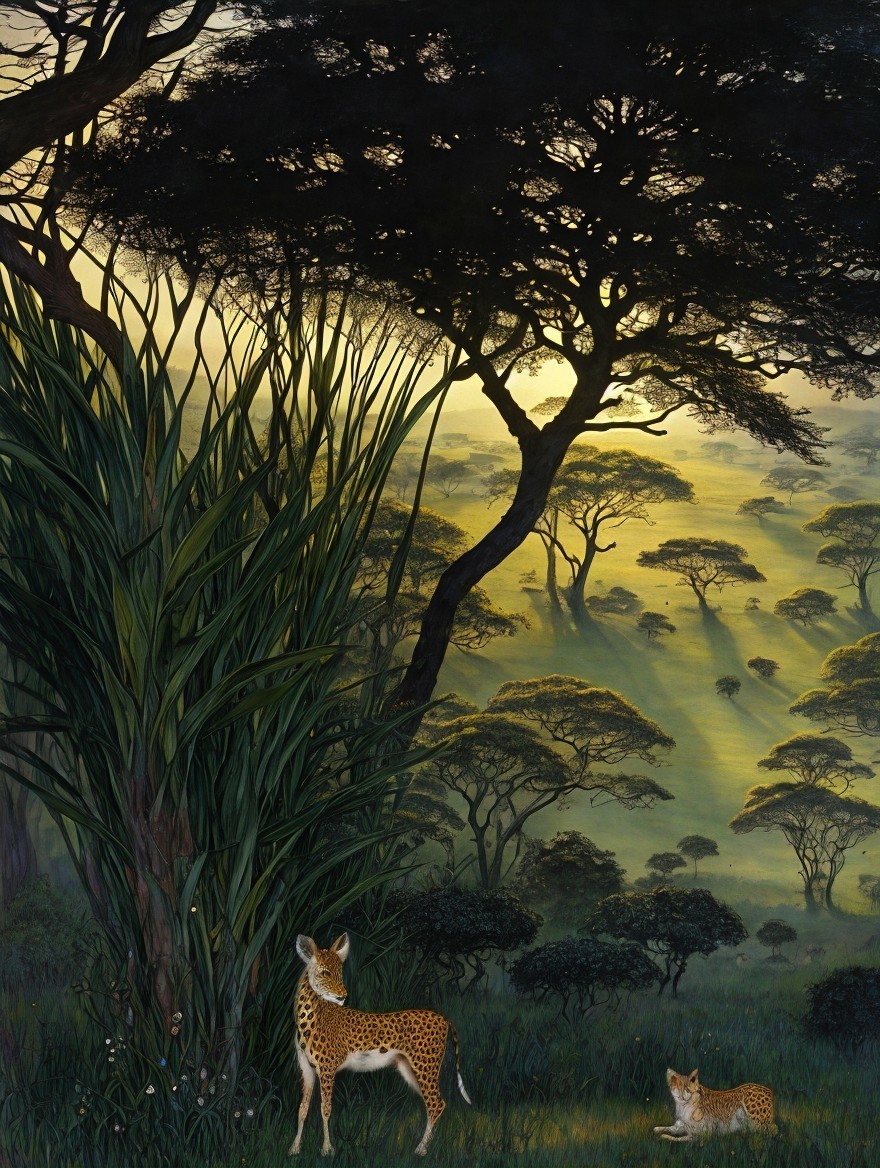 A woman in elegant attire stands under a tree with a sunset and wildlife in an African savanna setting.