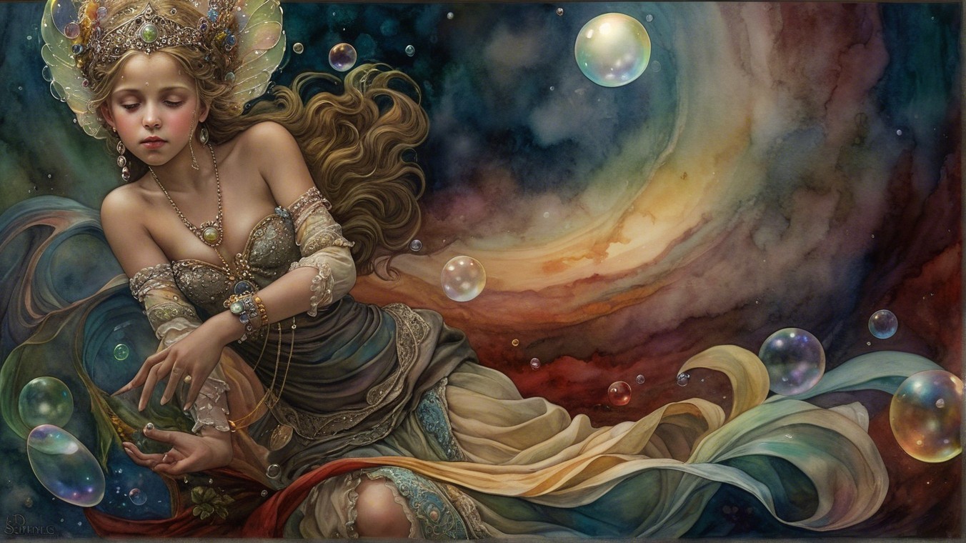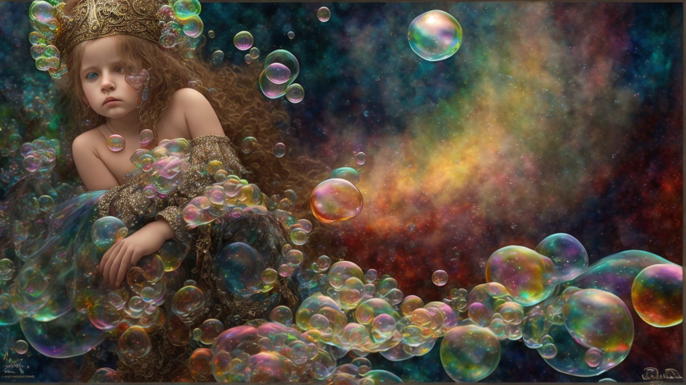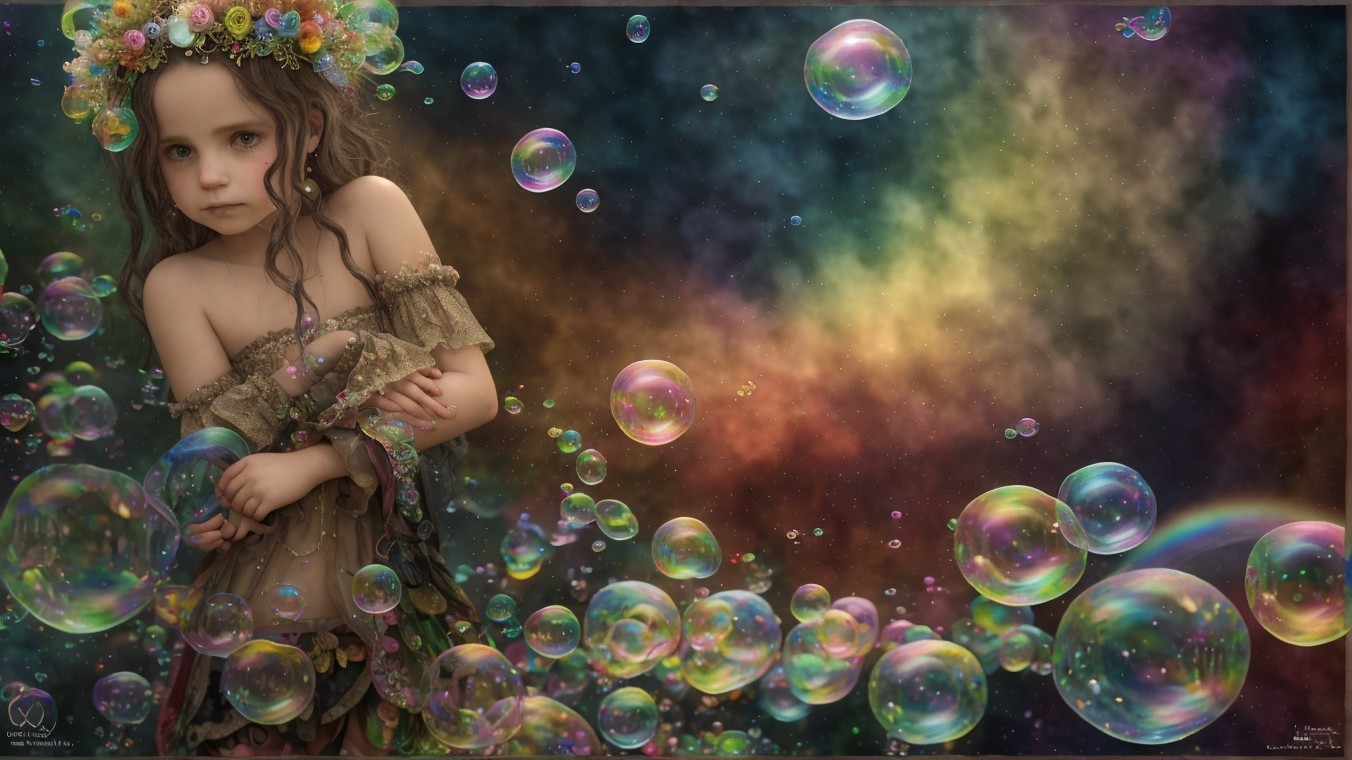A young girl with large, expressive eyes gazes dreamily at a colorful bubble. Surrounding her are various iridescent bubbles, creating a whimsical, enchanting atmosphere.