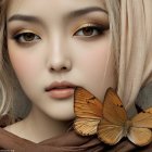A striking portrait of a woman with mesmerizing green eyes and full lips, adorned with butterfly motifs and floral elements. Her serene expression blends elegance and nature's beauty.