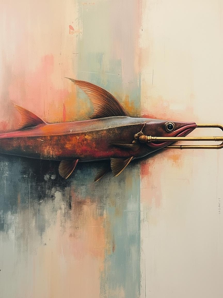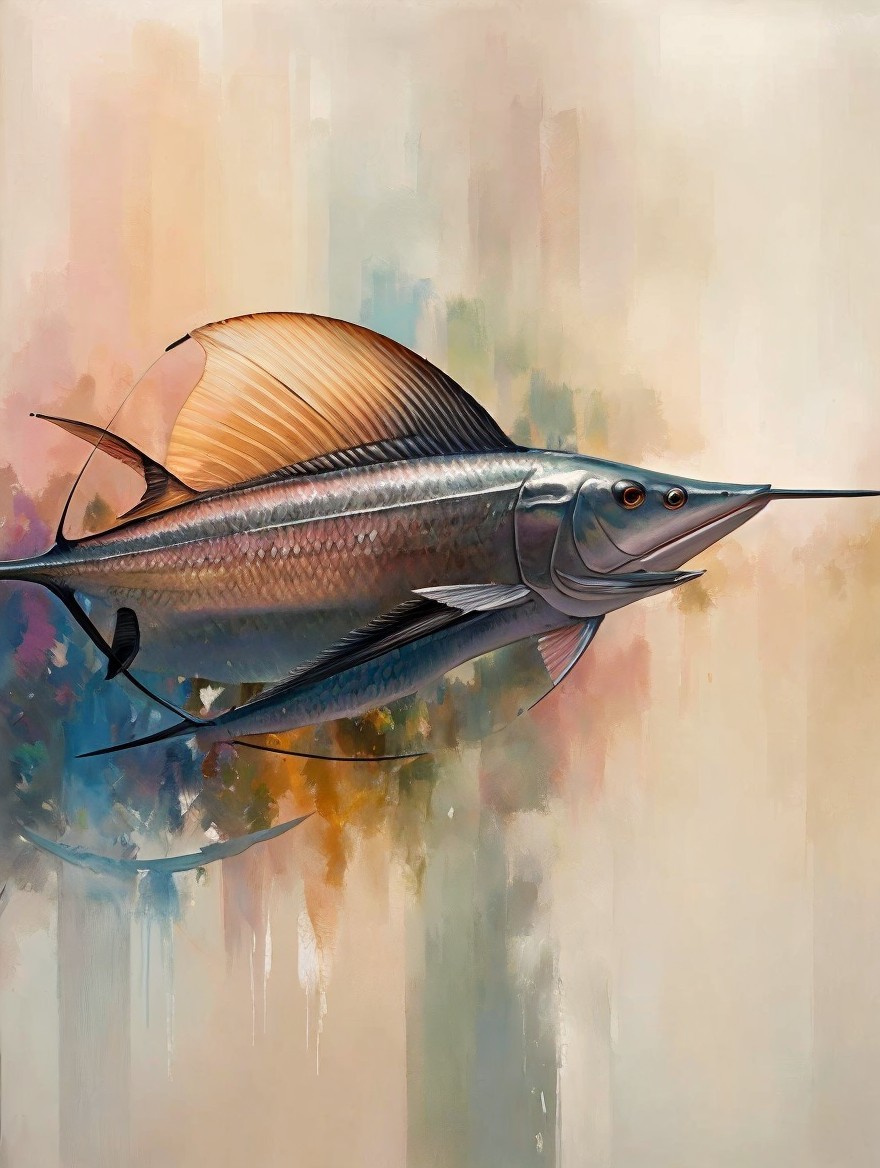 A graceful fish with elongated fins and a streamlined body swims against a soft, abstract background of pastel colors, adding an artistic touch to its aquatic elegance.