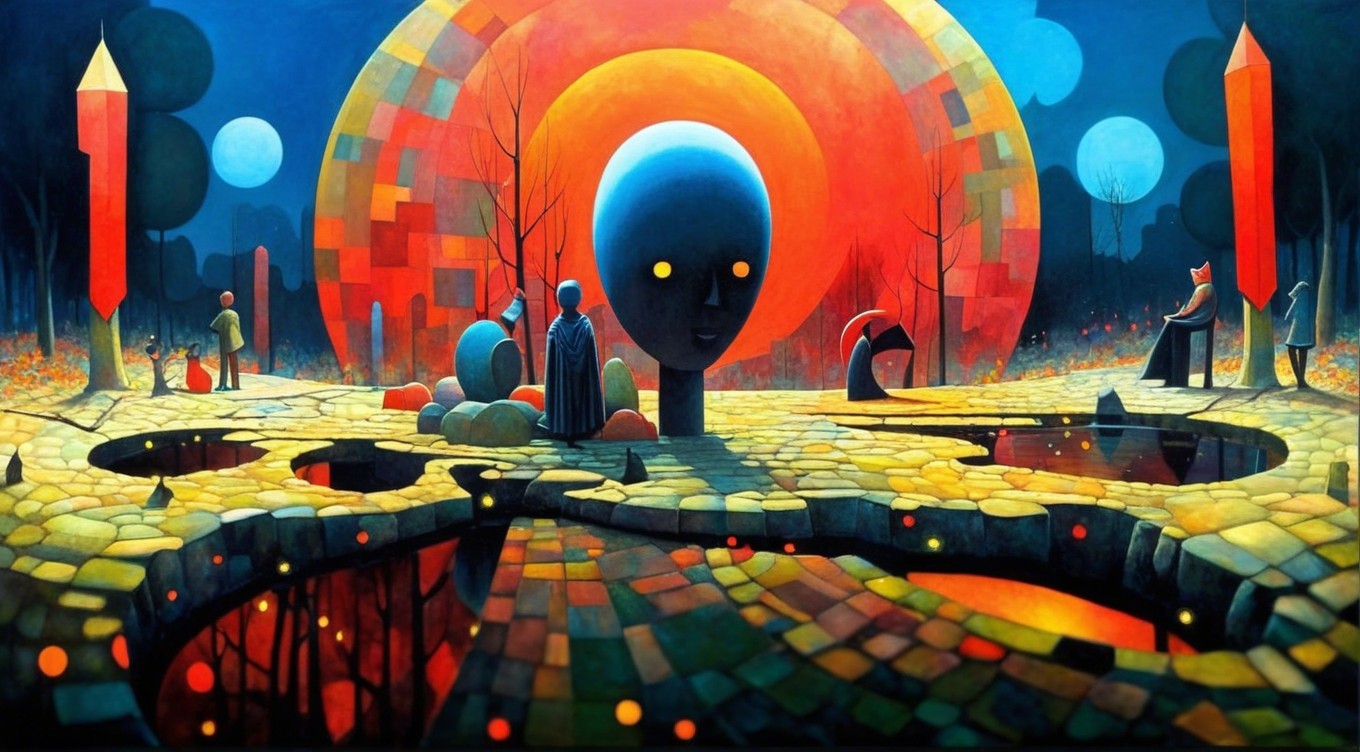 A vibrant, surreal landscape filled with bold colors. A large, faceless head dominates the scene, surrounded by abstract figures, geometric shapes, and reflections in water, evoking a dreamlike atmosphere.