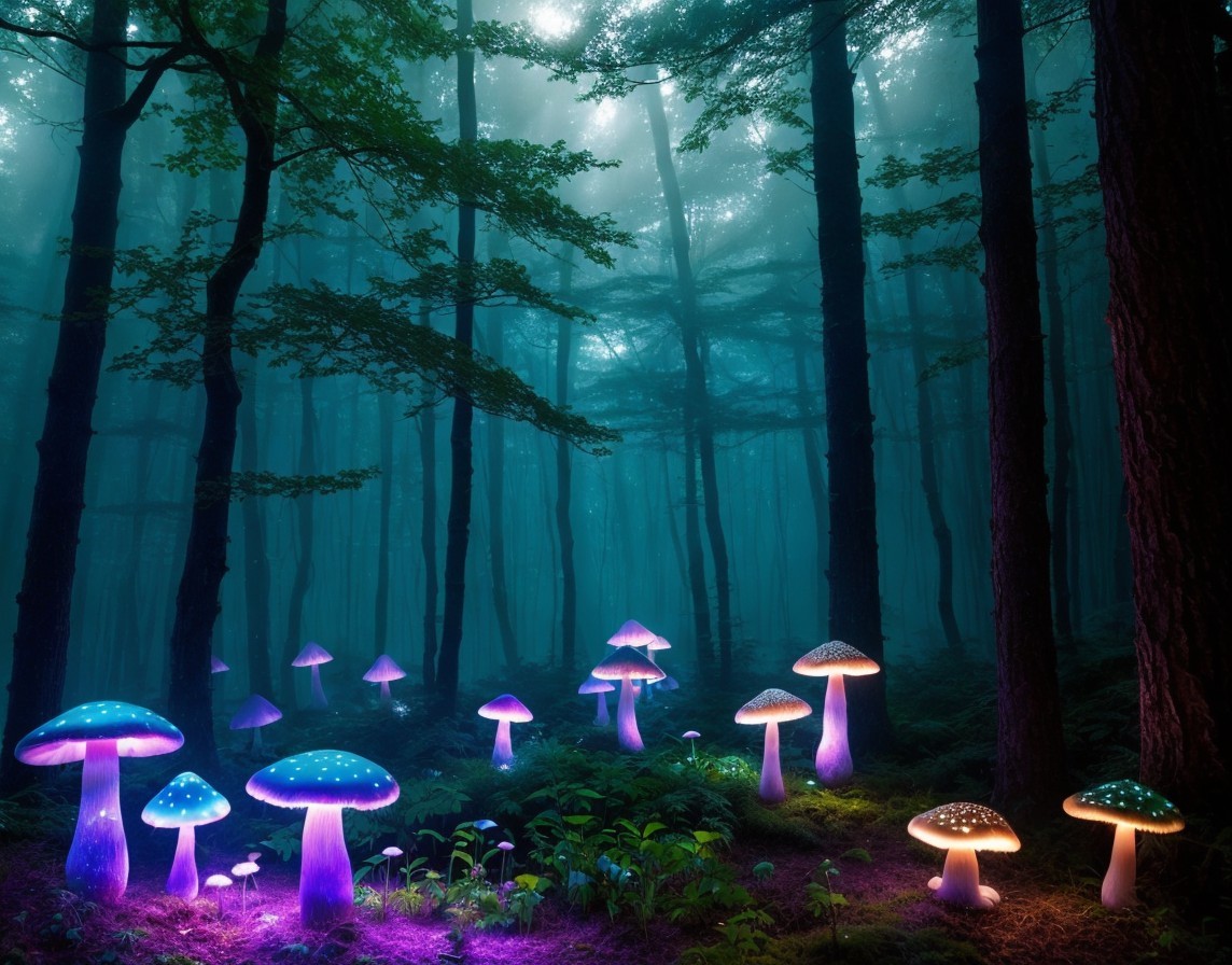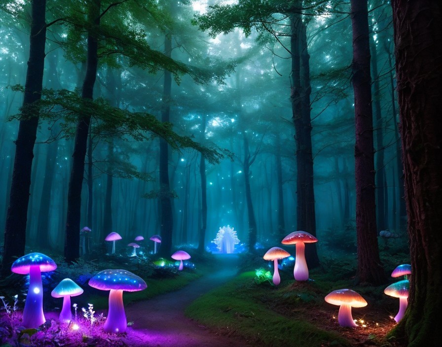 a magical scene of an enchanted forest illuminated by the soft glow of whimsical mushrooms. The atmosphere is serene and mystical, inviting you to explore the wonders hidden within