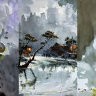 A moody cityscape features a reflective street with vintage cars and elegant architecture under a foggy sky. Nearby, a glamorous woman gazes thoughtfully, her bold red lips contrasting the scene.