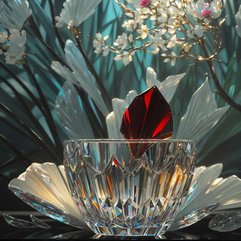 Chinese Crystals, Art Deco, Deep Rich Triadic Colors, Lalique Glass, style of Flamenco, highly detailed. focused Diffused light Light reflection Ambient occlusion Transparency digital age, 8k, acrylic painting by Akihiko Yoshida, intricate detailed, hyper-detailed, cinematic lighting, photorealistic, soft shadow, main colors Silver, Black and Silver. "Silver lightig" [sparkling polished metal]