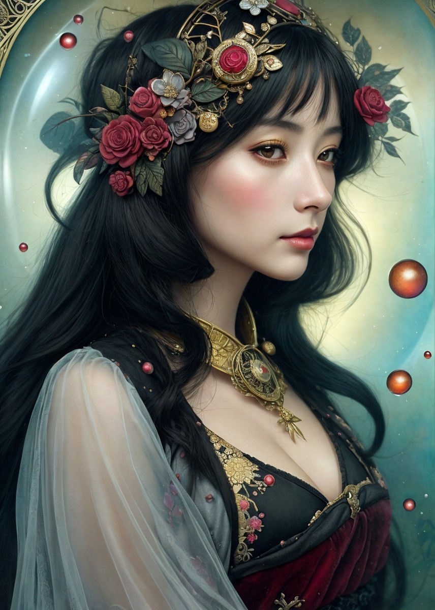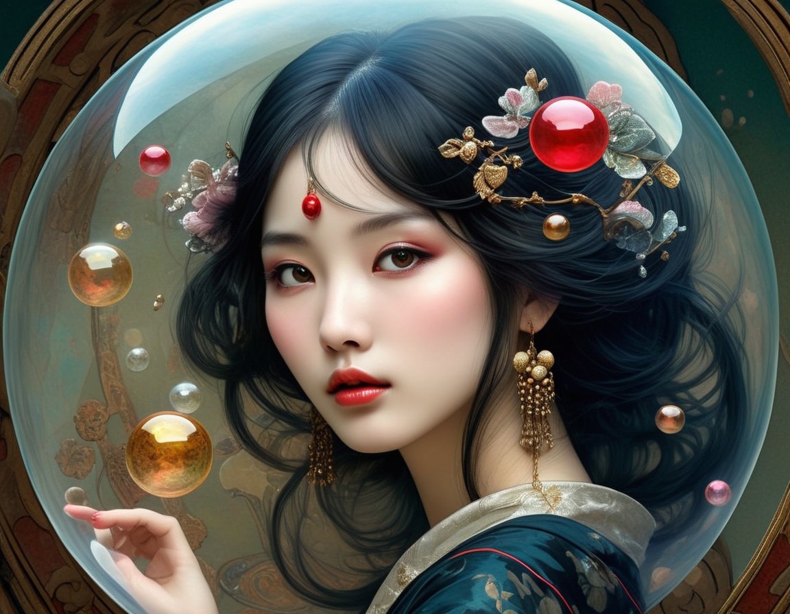 Beauty girl in a bubble,, Medieval Japanese Artists Sumi-e Style, Ruby red, Velvet Black, Shabby, Dull Gold, Amber Gray, Golden Ratio, Surreal Fantasy, Elegant, High Definition Ultra Fine 3D Line, Zenangle Style, Watercolor Patchwork , Arthur Rackham Style, Paul Kidby, , Jacek yerka, Extremely Detailed, Intricate, Thoughtful, HDR, Fractal, Beautiful, Award Winning, Fantasy Look, Fantasy, Crisp Quality