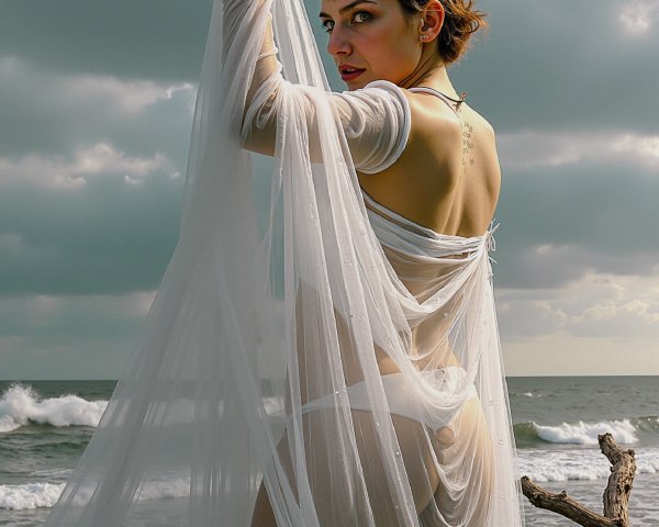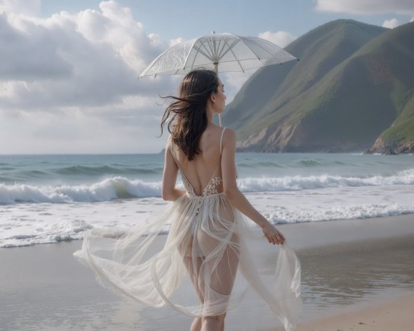 A woman in a delicate, sheer dress walks along the beach, holding a transparent umbrella. The waves crash gently, with lush green hills and a cloudy sky in the background, creating a serene atmosphere.