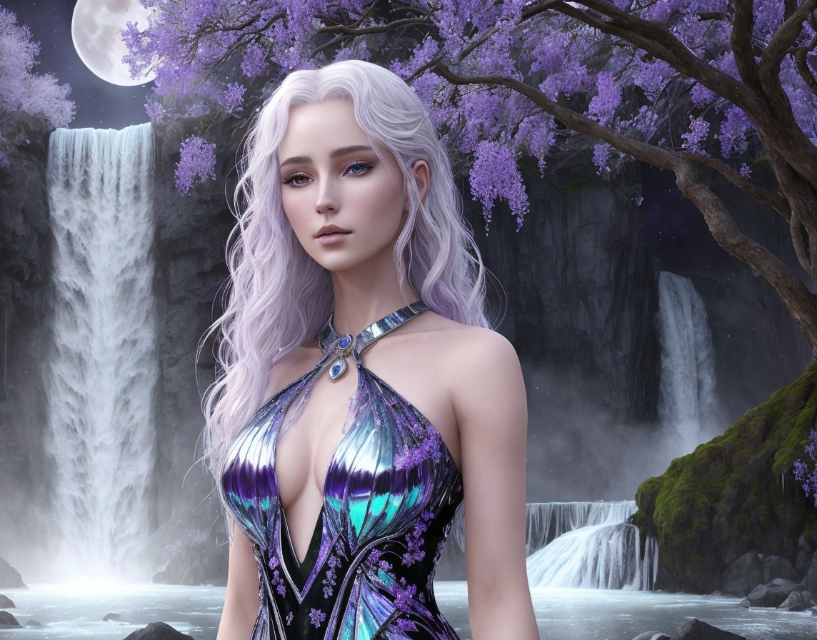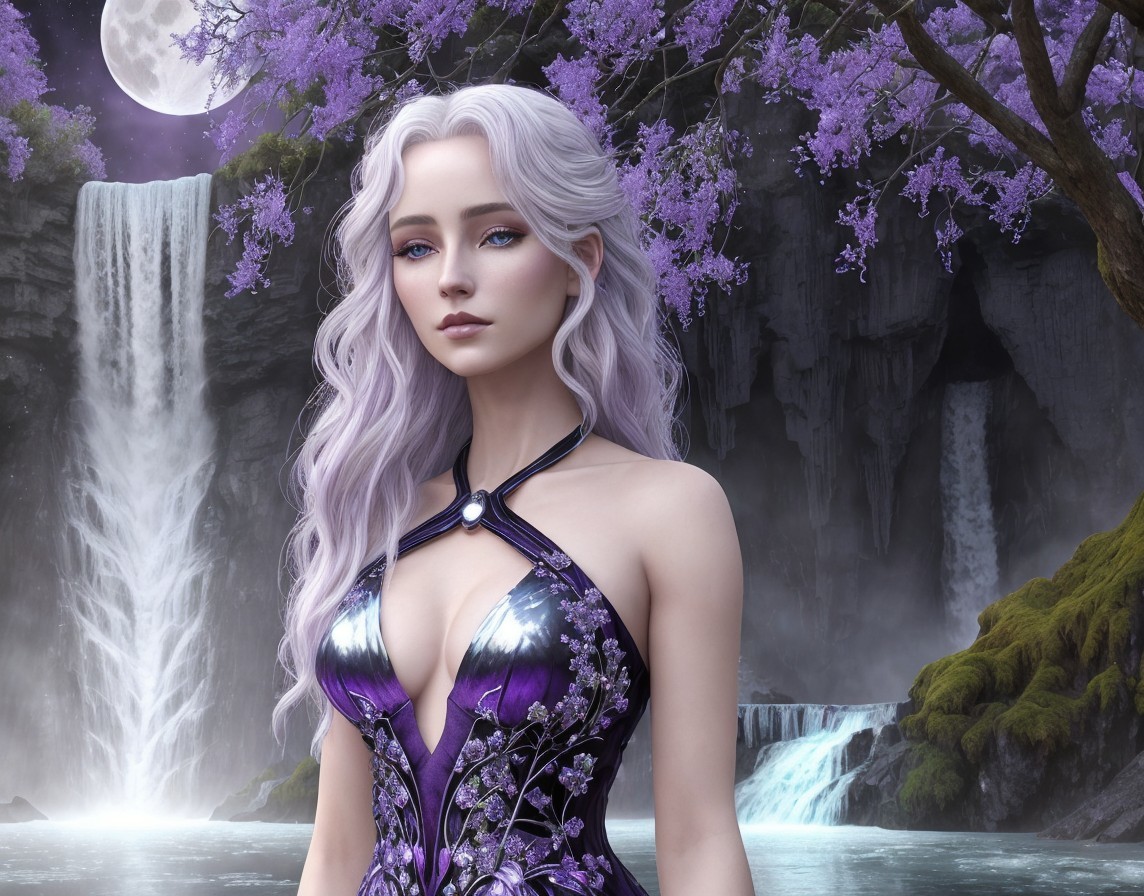 A fantastical image of a silver-haired woman with violet eyes, wearing a purple dress, in front of a moonlit waterfall and cherry blossoms.