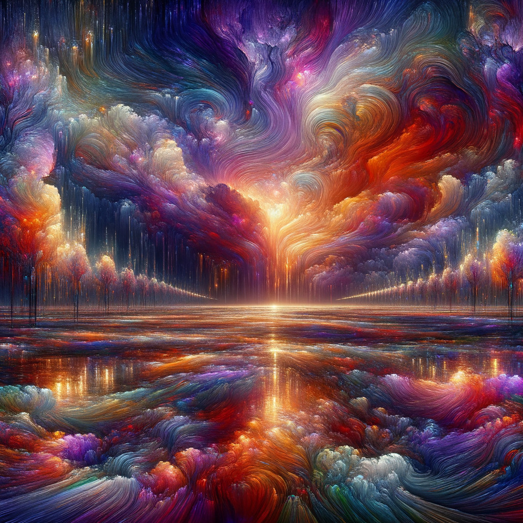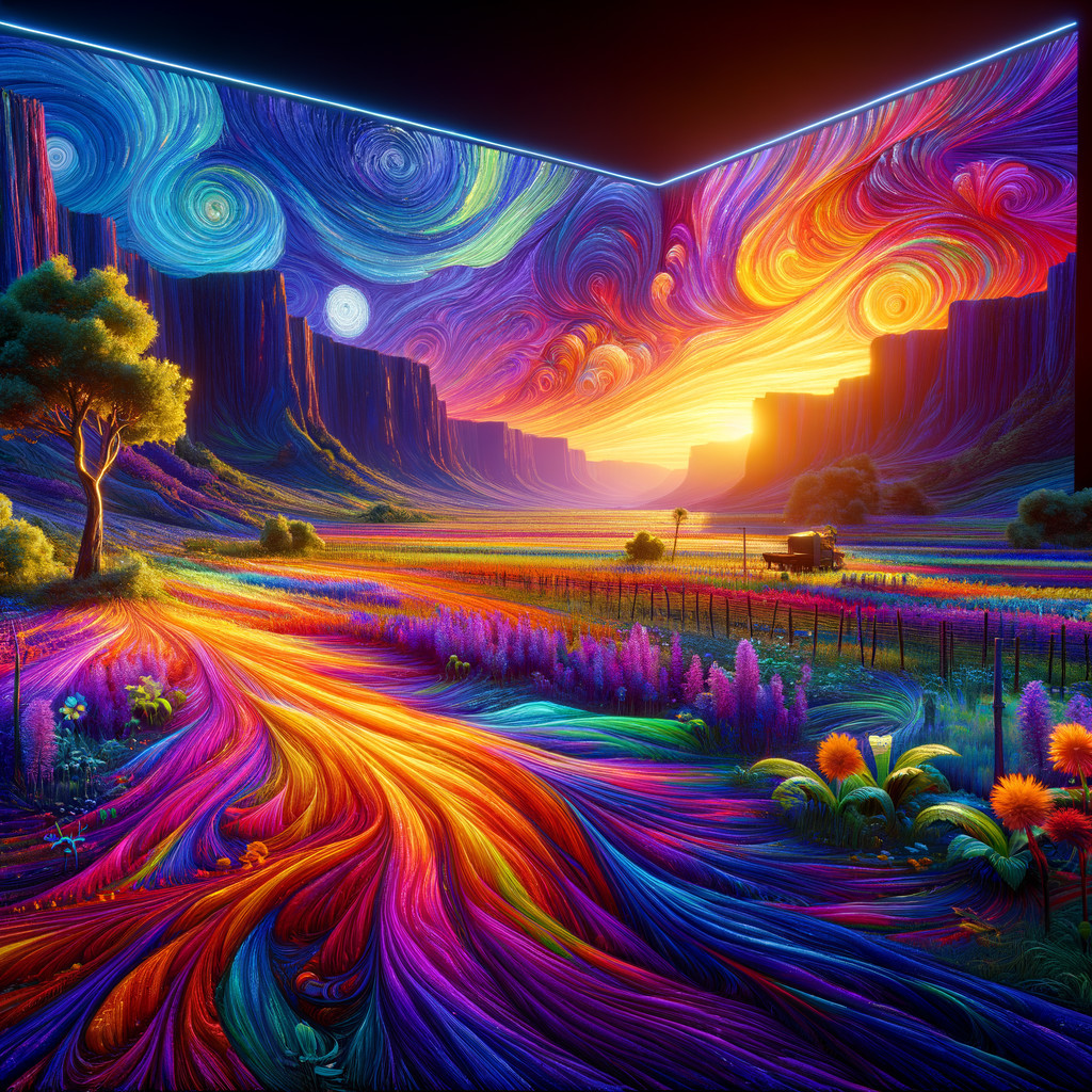 Prompt: "Lost on the central plains of desperation. Jessica Rossier, Van Gogh, Luis Royo, Renoir, atmospheric, vivid colors, psychedelic, acid influence, 3D render, 3D shading, light reflections, luminous, back-lit, glowing, very colorful, purples, reds, orange, green"