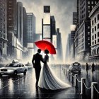 A stylish woman in a white dress stands with an umbrella beside a vintage red car, amid a rainy city street bustling with people, all under umbrellas, reflecting a vibrant urban atmosphere.