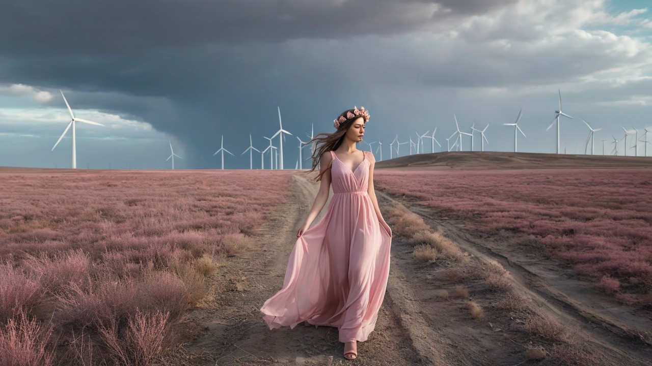 A woman in a flowing pink dress walks barefoot along a dirt path in a vibrant, pink landscape. Wind turbines stand tall against a dramatic, cloudy sky in the background.