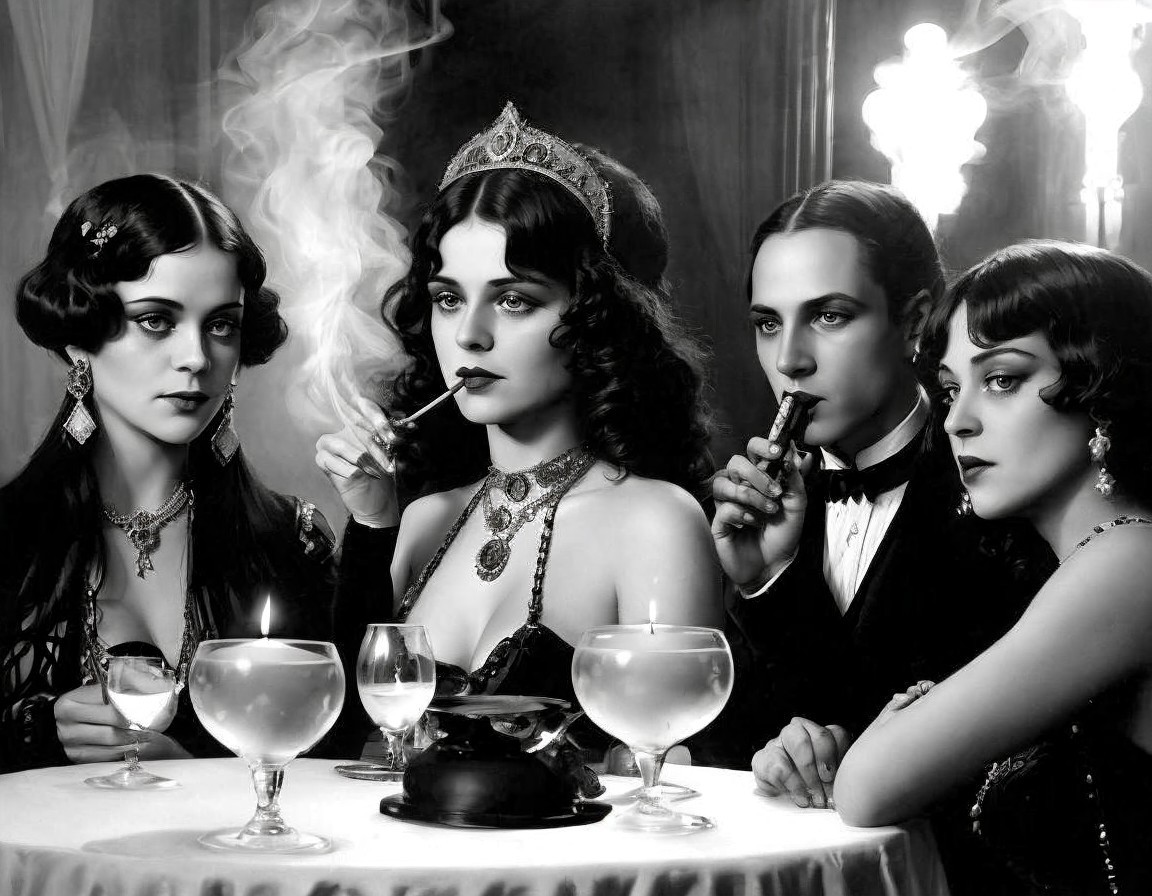 Prompt: "Moonshine in a dingy jazz club: cigar smoke, candles and velvet , an homage to the vamps of 1910’s-1920’s such as Theda Bara, Pola Negri, Evelyn Nesbt and Anita Berber. Imagine the paste of a rose incense"