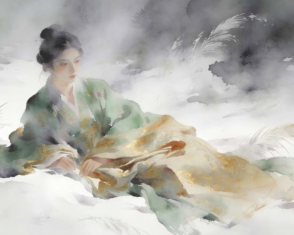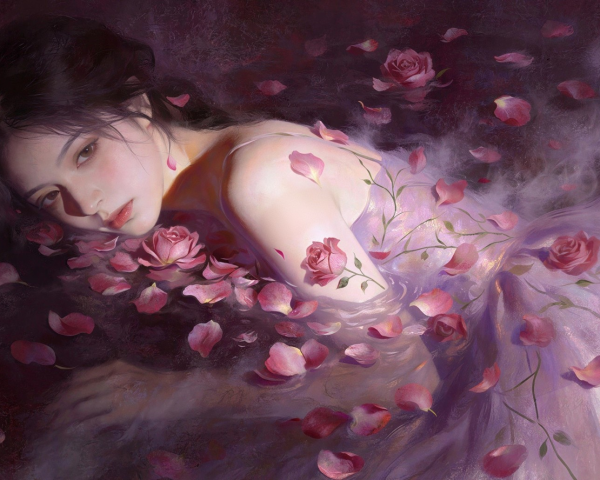 A ethereal figure with flowing purple hair adorned with orchids gazes softly. She wears a purple gown and delicate jewelry, set against a dreamy, lavender-hued background filled with stars.
