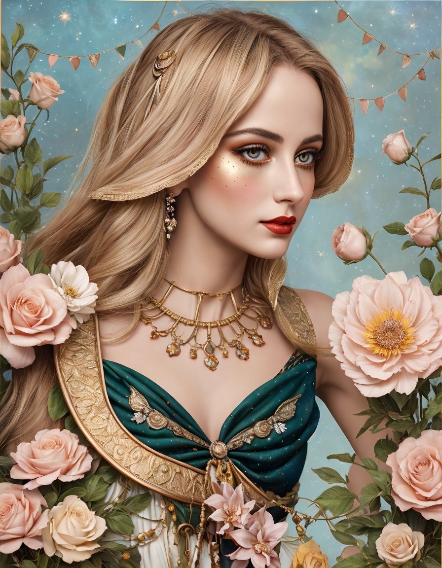 A portrait of a woman with stylized Renaissance attire and surreal, artistic makeup against a starry background with golden flora.
