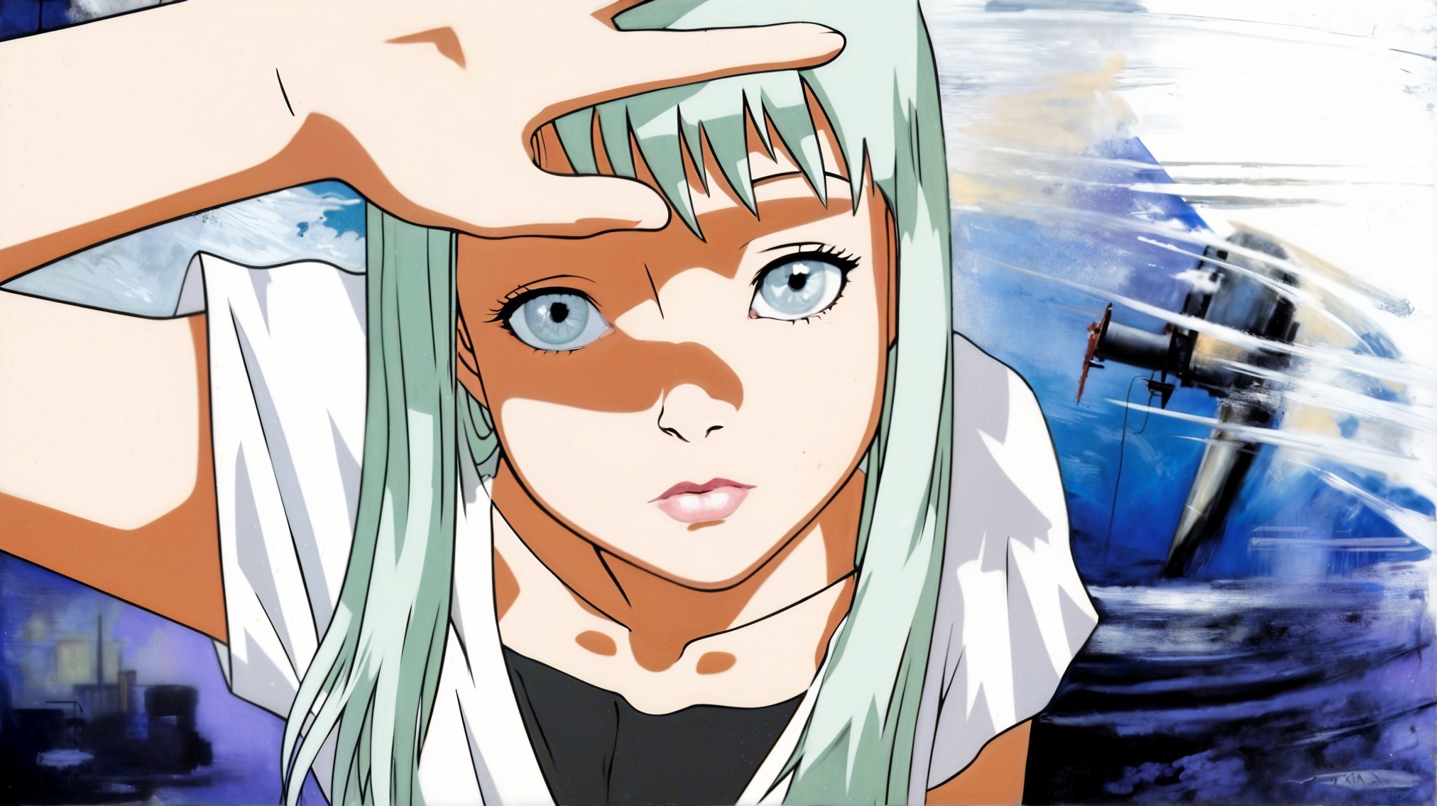 The image features a young woman with striking blue eyes and long, light green hair, shielding her face from a bright light. A moody, abstract background adds depth to her contemplative expression.