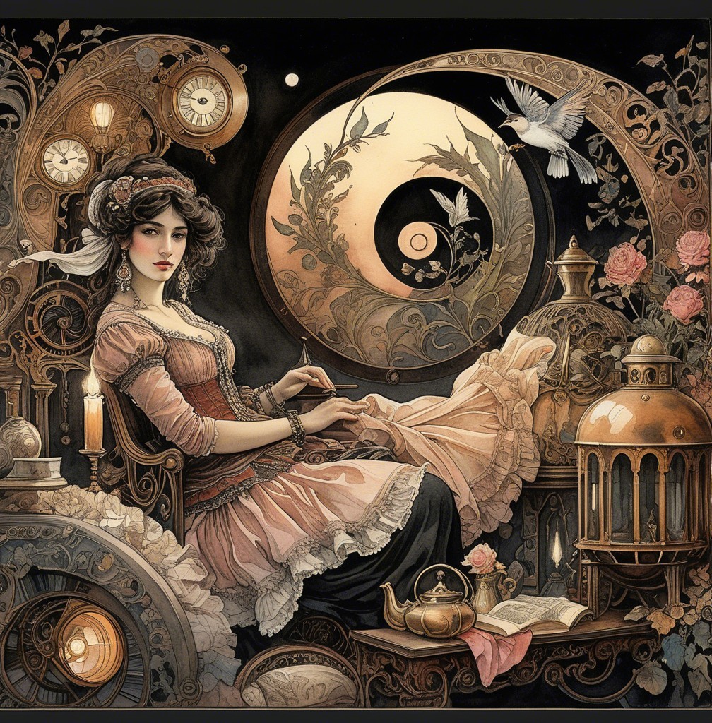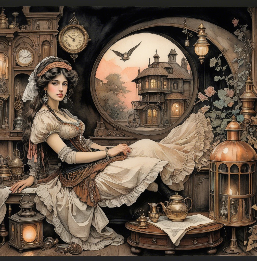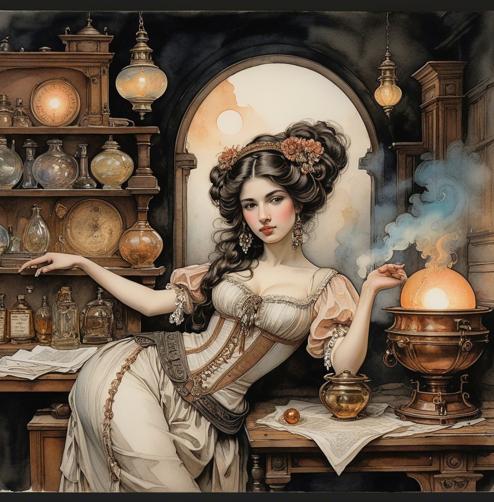 . Gypsy lady in the House of the spirits. , colored ink drawing, watercolor artwork on old withered paper, vintage, by Caravaggio, Fragonard, Anton Pieck, pale colors, high detail, intricately detailed, hyperdetailed volumetric lighting, art nouveau graphic steampunk ., whimsical, beautiful, poignant, touching. colors blush bronze, black. soft watercolor extra water in magical realism by Annigoni, Egon Schiele, Milo Manara, Botticelli, Catrin Welz-Stein, Jean Metzinger, Klimt, perfect eyes, perfect handsface, highly detailed, complementary colors, hyper detailed. Watercolor and ink splatter, dynamic pose, dark blue background, unreal engine, alphonse mucha, global illumination, detailed and intricate environment Beautiful woman in the style of Pino Daeni Dorota Piotrowiak Edward Gorey, junji ito, klimnt , gold leaf color, silver leaf color beautiful dynamic lighting high definition hdr * Random prompt award winning Max Ernst ultra detailed 4K 3D Texture