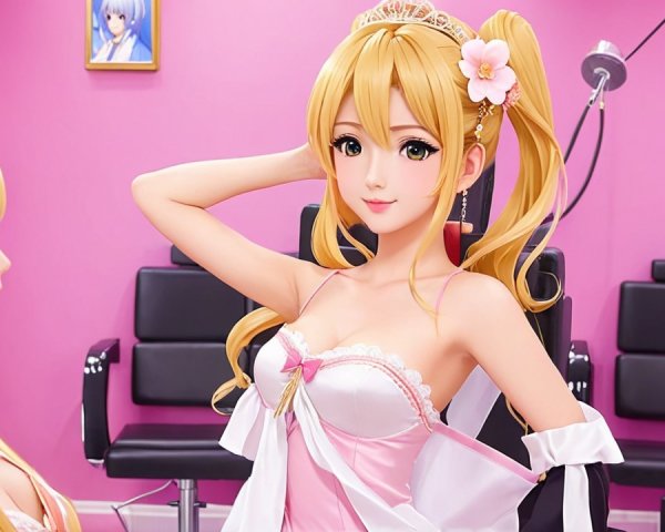A vibrant anime girl dons a stunning strapless golden swimsuit, radiating confidence and charm. Her playful expression and lively pose capture the essence of summer fun and adventure.