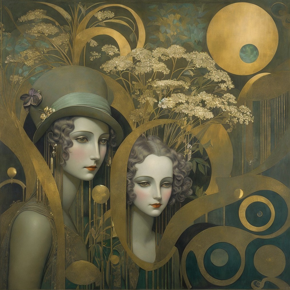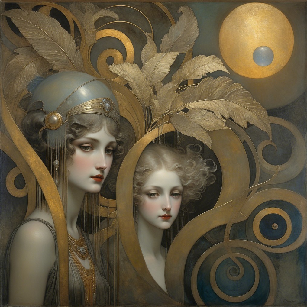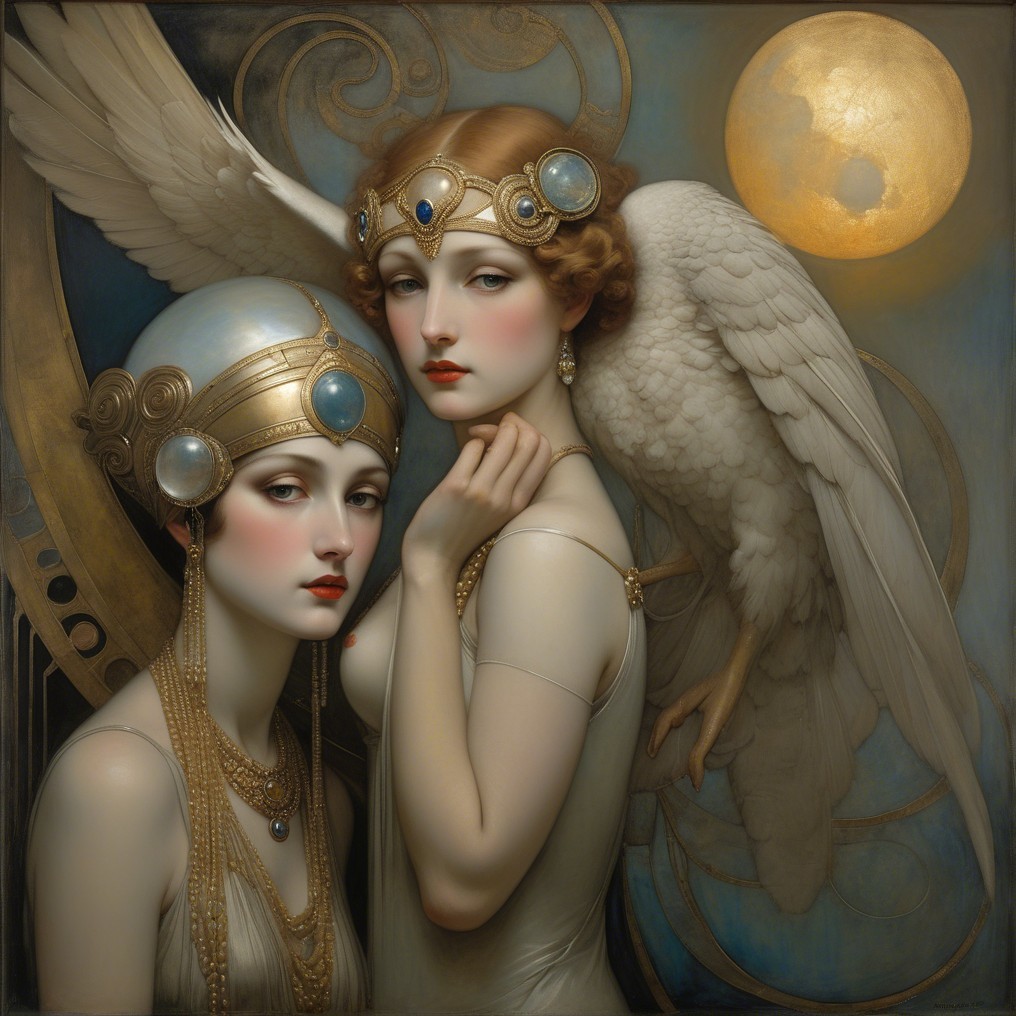The artwork features two elegant women, adorned in sparkling jewelry and vintage attire, against a rich, ornate background with a glowing moon, exuding a sense of timeless beauty and mystique.