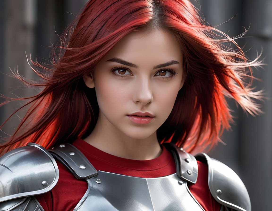 A young woman gazes confidently at the camera, her striking red hair flowing around her. She wears a gleaming silver armor over a deep red shirt, embodying strength and determination.