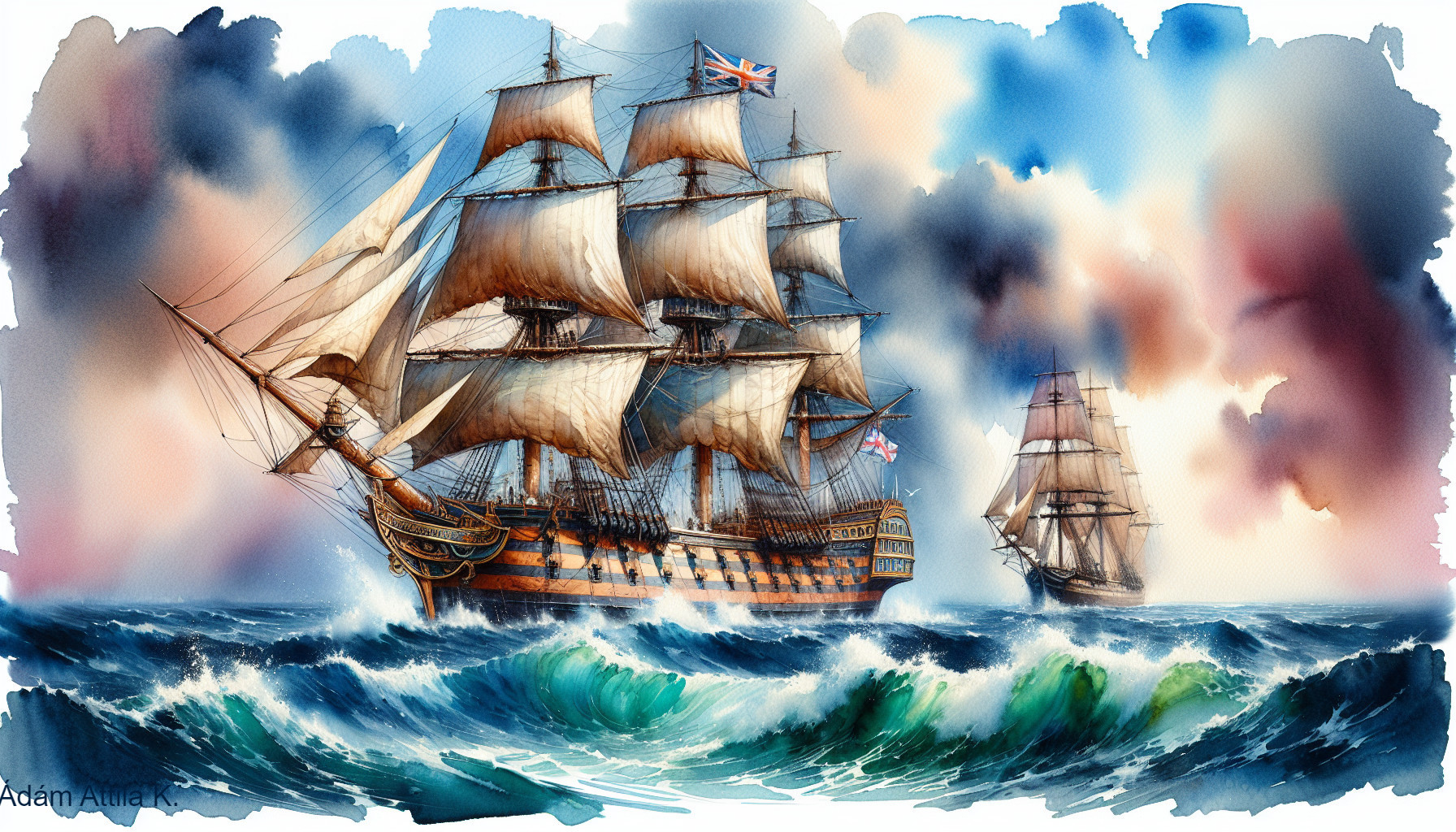 A stunning watercolor painting showcases two majestic ships braving vibrant blue waves. The larger ship features billowing sails and British flags, set against a dreamy, colorful sky.